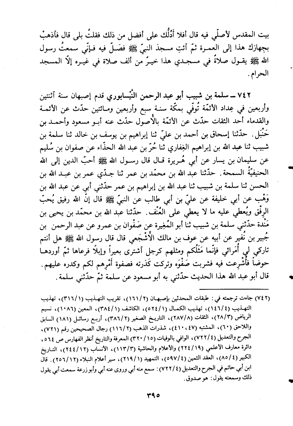 §سَلَمَةُ بْنُ شَبِيبٍ أَبُو عَبْدِ الرَّحْمَنِ النَّيْسَابُورِيُّ قَدِمَ أَصْبَهَانَ سَنَةَ اثْنَتَيْنِ وَأَرْبَعِينَ فِي عِدَادِ الْأَئِمَّةِ، تُوُفِّيَ بِمَكَّةَ سَنَةَ سَبْعٍ وَأَرْبَعِينَ وَمَائَتَيْنِ. حَدَّثَ عَنِ الْأَئِمَّةِ وَالْقُدَمَاءِ، أَحَدُ الثِّقَاتِ. حَدَّثَ عَنِ الْأَئِمَّةِ بِالْأُصُولِ. حَدَّثَ عَنْهُ أَبُو مَسْعُودٍ، وَأَحْمَدُ بْنُ حَنْبَلٍ