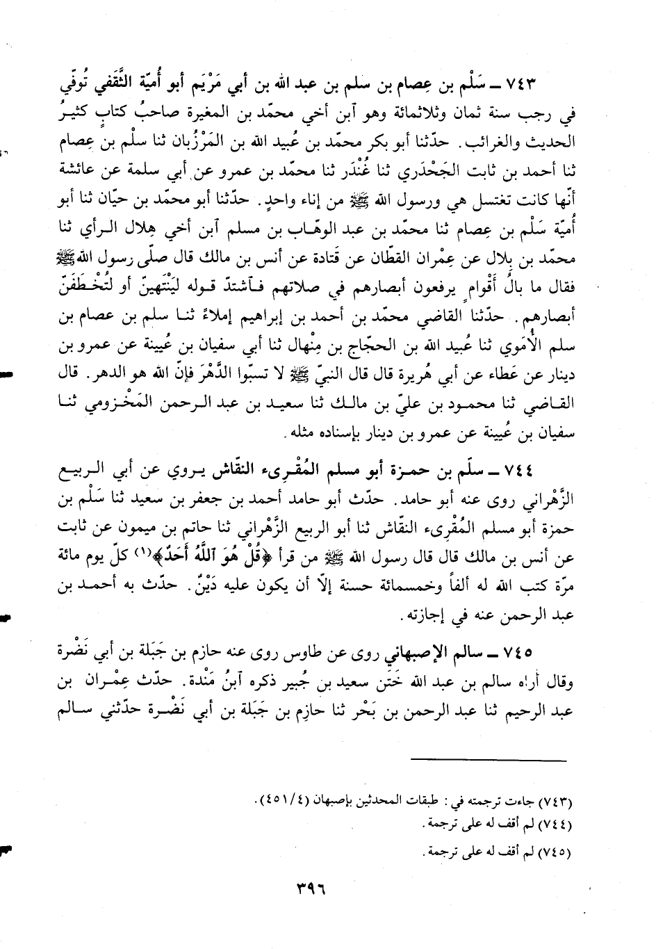 §743 - سَلَّمُ بْنُ عِصَامِ بْنِ سَلْمِ بْنِ عَبْدِ اللَّهِ بْنِ أَبِي مَرْيَمَ أَبُو أُمَيَّةَ الثَّقَفِيُّ تُوُفِّيَ فِي رَجَبٍ سَنَةَ ثَمَانٍ وَثَلَاثِمِائَةَ، وَهُوَ ابْنُ أَخِي مُحَمَّدِ بْنِ الْمُغِيرَةِ، صَاحِبُ كِتَابٍ، كَثِيرُ الْحَدِيثِ وَالْغَرَائِبِ