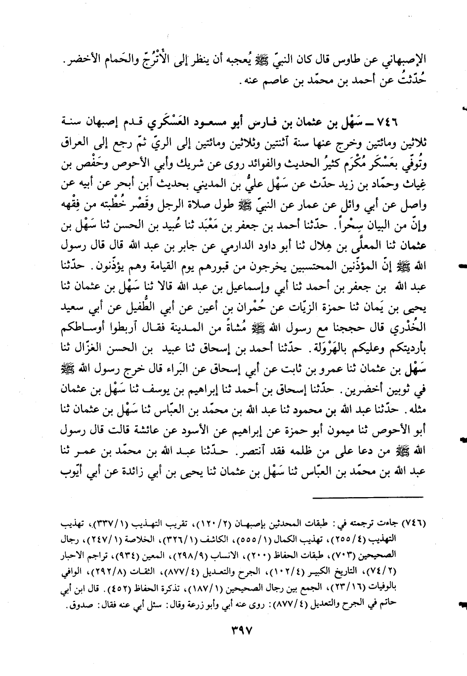 §سَهْلِ بْنِ عُثْمَانَ بْنِ فَارِسٍ أَبُو مَسْعُودٍ الْعَسْكَرِيُّ قَدِمَ أَصْبَهَانَ سَنَةَ ثَلَاثِينَ وَمَائَتَيْنِ وَخَرَجَ عَنْهَا سَنَةَ اثْنَتَيْنِ وَثَلَاثِينَ وَمَائَتَيْنِ إِلَى الرِّيِّ، ثُمَّ رَجَعَ إِلَى الْعِرَاقِ وَتُوُفِّيَ بِعَسْكَرِ مُكْرَمٍ، كَثِيرُ الْحَدِيثِ وَالْفَوَائِدِ، رَوَى عَنْ شَرِيكٍ، وَأَبِي الْأَحْوَصِ، وَحَفْصِ بْنِ غِيَاثٍ، وَحَمَّادِ بْنِ زَيْدٍ. حَدَّثَ عَنْ سَهْلِ، عَلِيُّ بْنُ الْمَدِينِيِّ بِحَدِيثِ ابْنِ أَبْحُرٍ، عَنْ أَبِيهِ، عَنْ وَاصِلٍ، عَنْ أَبِي وَائِلٍ، عَنْ عَمَّارٍ، عَنِ النَّبِيِّ صَلَّى اللهُ عَلَيْهِ وَسَلَّمَ: «طُولُ صَلَاةِ الرَّجُلِ، وَقِصَرُ خُطْبَتِهِ مِنْ فِقْهِهِ، وَإِنَّ مِنَ الْبَيَانِ سِحْرًا»