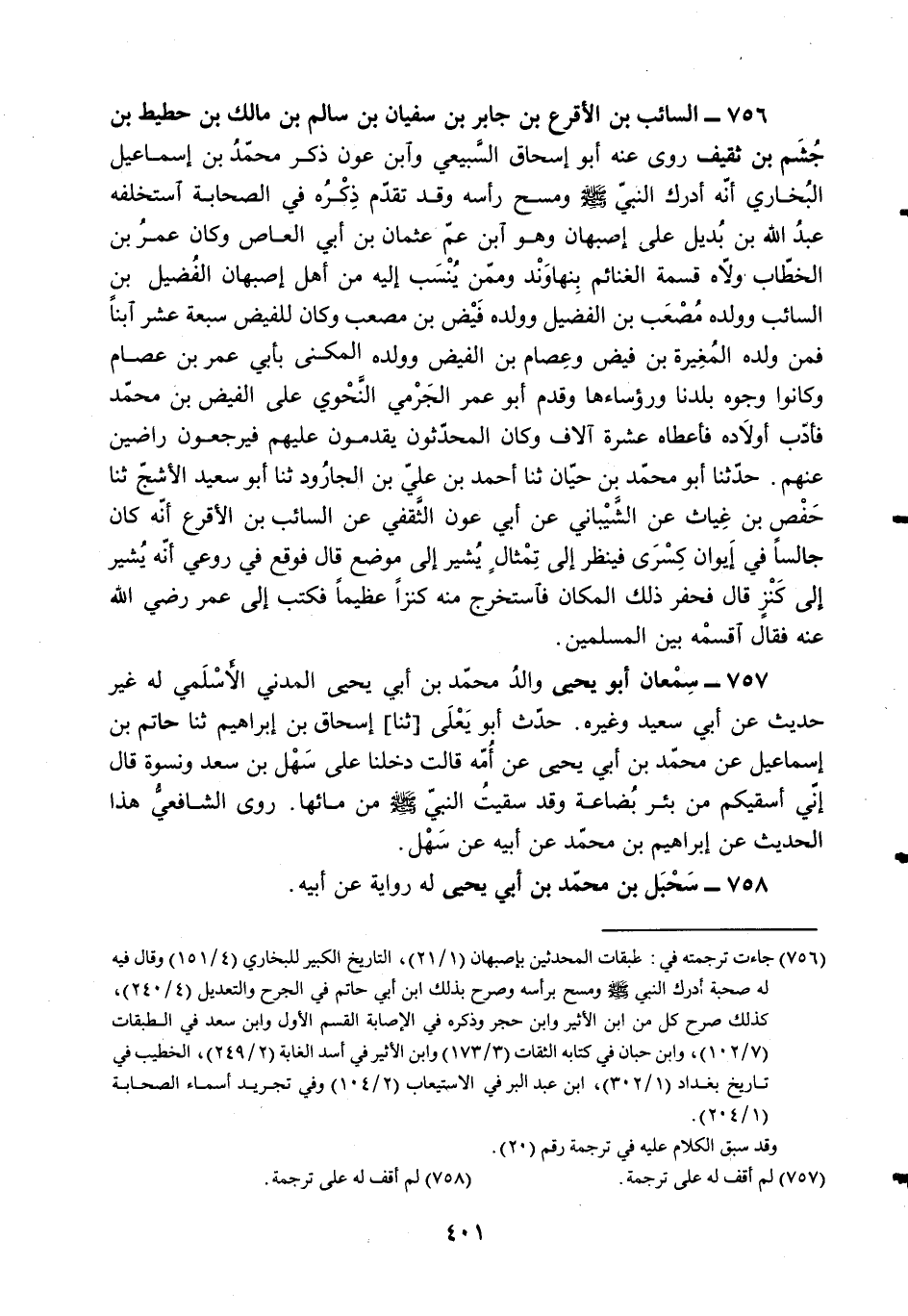 §756 - السَّائِبُ بْنُ الْأَقْرَعِ رَوَى عَنْهُ أَبُو إِسْحَاقَ السَّبِيعِيُّ، وَابْنُ عَوْنٍ، ذَكَرَ مُحَمَّدُ بْنُ إِسْمَاعِيلَ الْبُخَارِيُّ أَنَّهُ أَدْرَكَ النَّبِيَّ صَلَّى اللهُ عَلَيْهِ وَسَلَّمَ وَمَسَحَ رَأْسَهُ، وَقَدْ تَقَدَّمَ ذِكْرُهُ فِي الصَّحَابَةِ، اسْتَخْلَفَهُ عَبْدُ اللَّهِ بْنُ بُدَيْلٍ عَلَى أَصْبَهَانَ وَهُوَ ابْنُ عَمِّ عُثْمَانُ بْنُ أَبِي الْعَاصِ، وَكَانَ عُمَرُ بْنُ الْخَطَّابِ وَلَّاهُ قِسْمَةَ الْغَنَائِمِ بِنَهَاوَنْدَ، وَمِمَّنْ يُنْسَبُ إِلَيْهِ مِنْ أَهْلِ أَصْبَهَانَ الْفُضَيْلُ بْنُ السَّائِبِ وَوَلَدُهُ مُصْعَبُ بْنُ الْفُضَيْلِ وَوَلَدُهُ فَيْضُ بْنُ مُصْعَبٍ، وَكَانَ لِلْفَيْضِ سَبْعَةَ عَشْرَةَ ابْنًا، فَمِنُ وَلَدِهِ الْمُغِيرَةُ بْنُ فَيْضٍ، وَعِصَامُ بْنُ الْفَيْضِ وَوَلَدُهُ الْمُكَنَّى بِأَبِي عَمْرِو بْنِ عِصَامٍ، وَكَانُوا وُجُوهَ بَلَدِنَا وَرُؤَسَاءِهَا، وَقَدِمَ أَبُو عُمَرَ الْجَرْمِيُّ النَّحْوِيُّ عَلَى الْفَيْضِ بْنِ مُحَمَّدٍ فَأَدَّبَ أَوْلَادَهُ فَأَعْطَاهُ عَشْرَةَ آلَافٍ، وَكَانَ الْمُحْدِثُونَ يَقْدُمُونَ عَلَيْهِمْ فَيَرْجِعُونَ رَاضِينَ عَنْهُمْ
