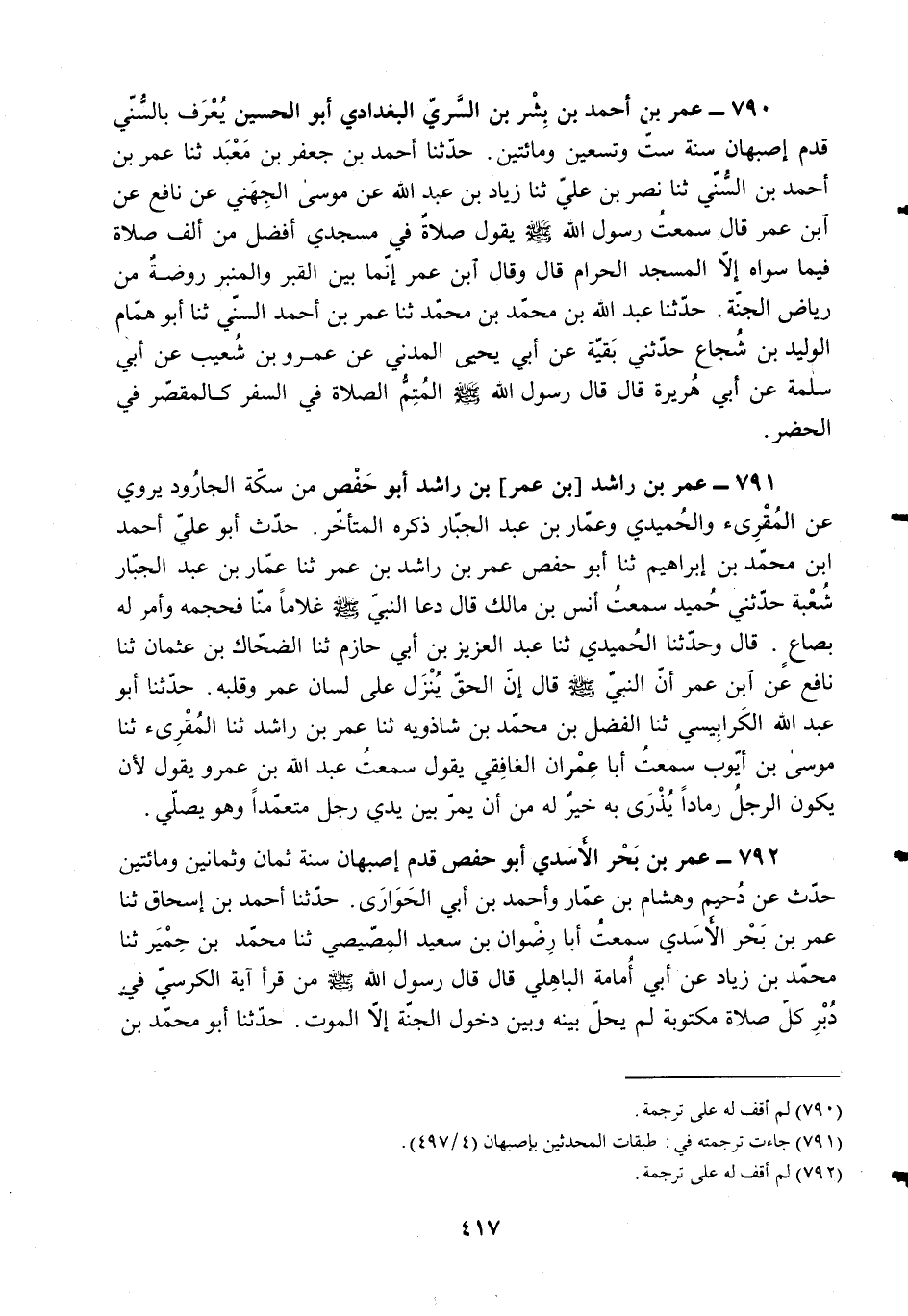 §790 - عُمَرُ بْنُ أَحْمَدَ بْنِ بِشْرٍ يُعْرَفُ بِالسُّنِّيُّ قَدِمَ أَصْبَهَانَ سَنَةَ سِتٍّ وَتِسْعِينَ وَمَائَتَيْنِ