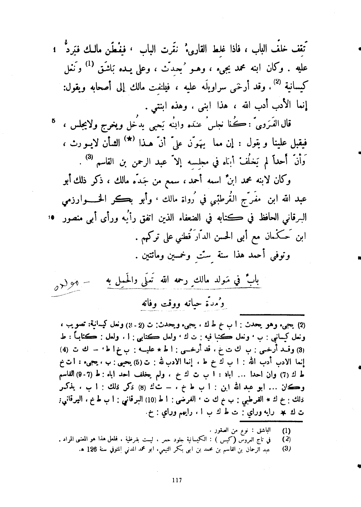وكان تقف خلف الباب فإذا غلط القارىء نقرت الباب فيفطن مالك فيرد عليه.