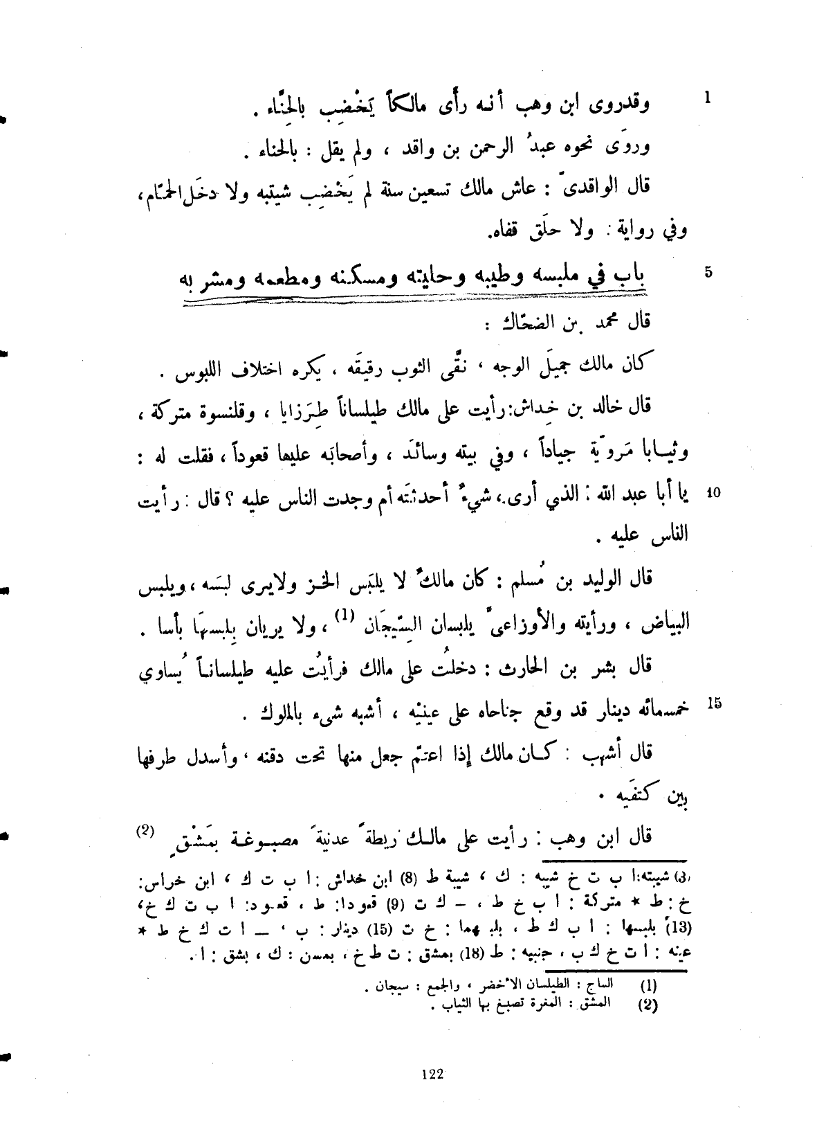 قال ابن وهب: رأيت على مالك ريطة عدنية مصبوغة بمشق