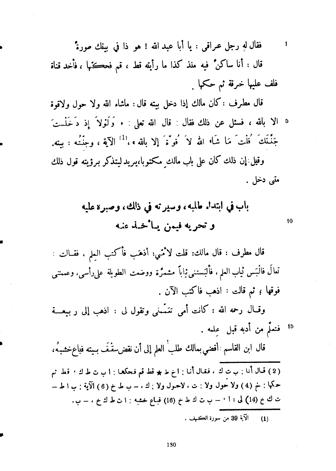 قال مطرف، قال مالك: قلت لأمي أذهب فأكتب العلم؟ فقالت تعال فالبس ثياب العلم.