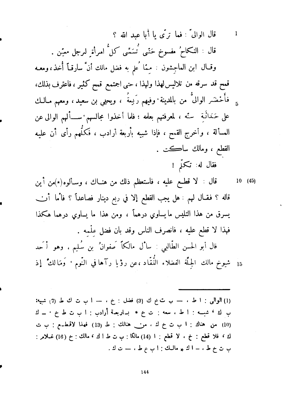 وقال ابن الماجشون: مما علم به مالك أن، سارقاً أخذ ومعه قمح وقد سرقه من تلاليس لهذا وهذا، حتى اجتمع قمح كثير فاعترف بذلك فأحضر الوالي من بالمدينة وفيهم ربيعة ويحيى بن سعيد ومعهم مالك على حداثة سنه لمعرفتهم بعلمه، فلما أخذوا مجالسهم سألهم الوالي عن المسألة.