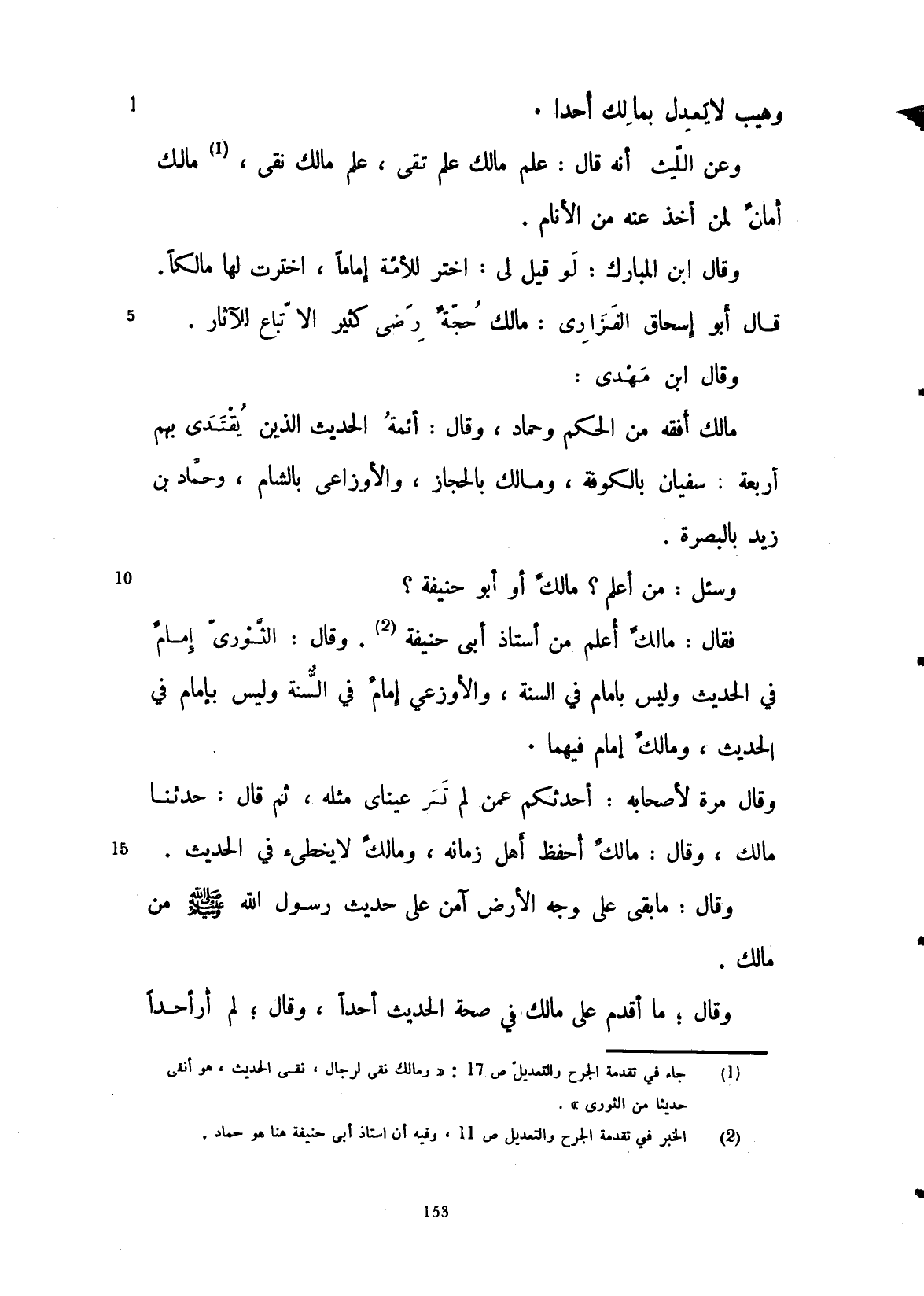 ثم قال حدثنا مالك، وقال مالك أحفظ أهل زمانه، ومالك لا يخطىء في الحديث، وقال لم يبق على وجه الأرض آمن على حديث رسول الله صلى الله عليه وسلم من مالك.