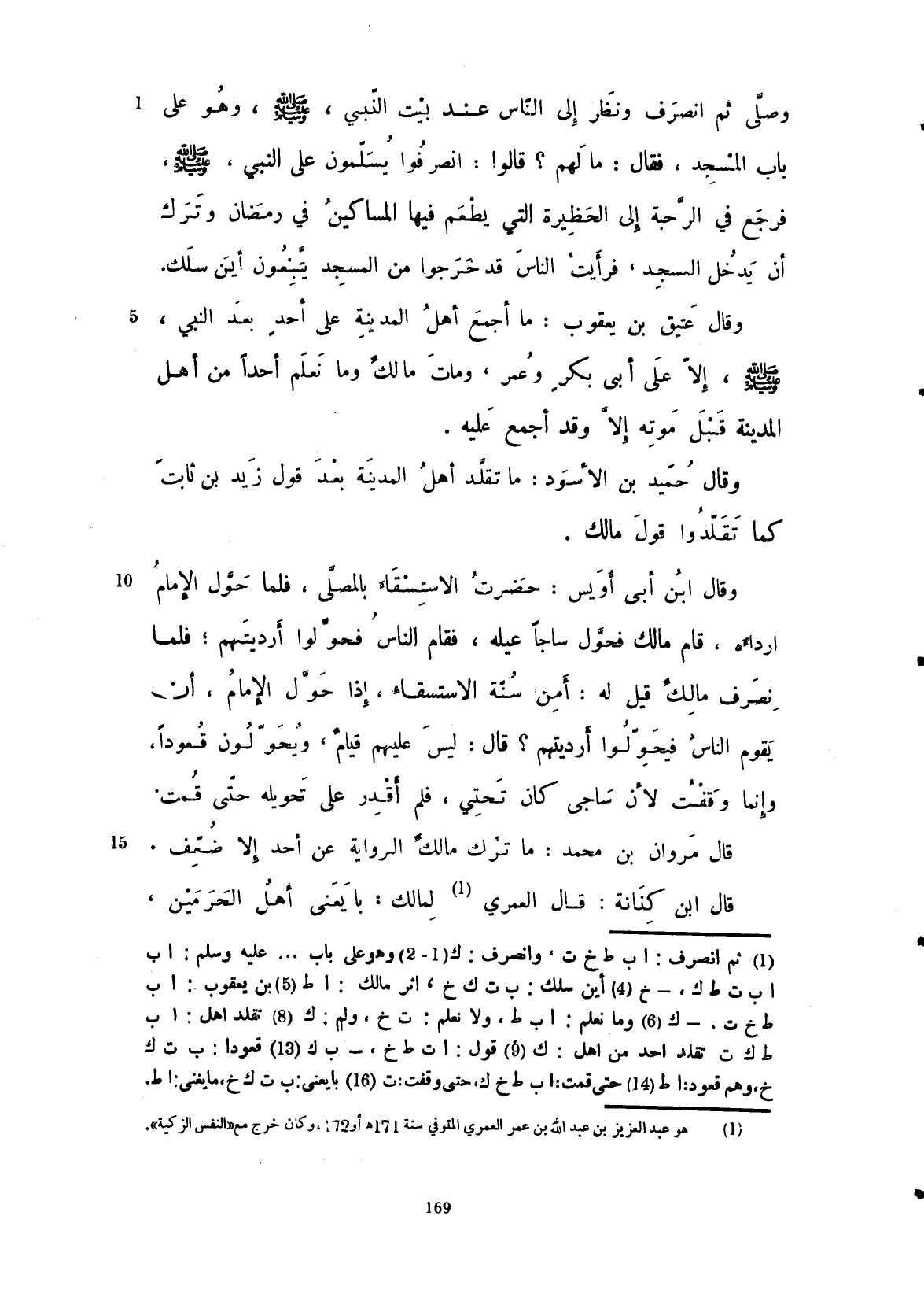 فقال ما لهم؟ قال: انصرفوا يسلمون على النبي صلى الله عليه وسلم فرجع إلى الحظيرة التي يطعم فيها المساكين في رمضان، وترك أ، يدخل المسجد فرأيت الناس قد خرجوا من المسجد يتبعون أين مالك؟ وقال عتيق: ما أجمع أهل المدينة على أحد بعد النبي صلى الله عليه وسلم إلا على أبي بكر وعمر، ومات مالك ولم نعلم أن أحداً من أهل المدينة قبل موته إلا وقد أجمع عليه.