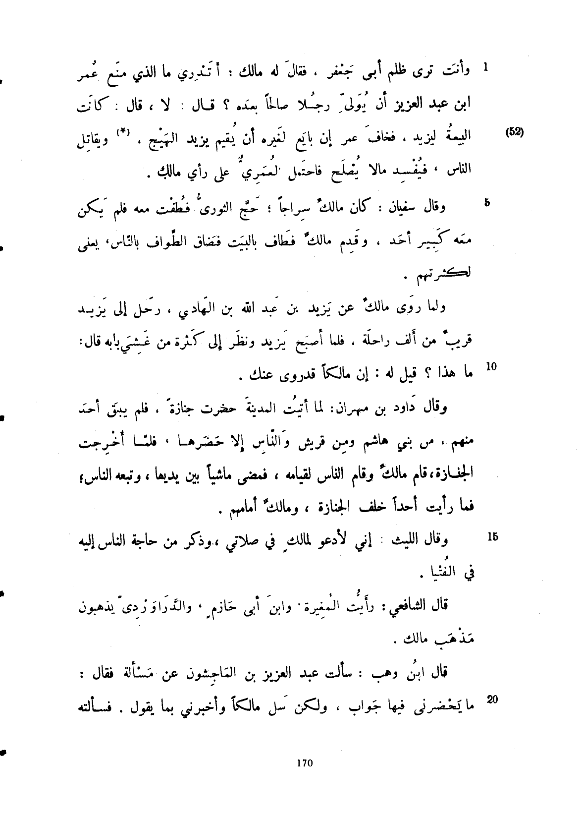 فقال له مالك تدري ما الذي منه عمر بن عبد العزيز أن يولى رجلاً صالحاً بعده؟ قال لا، قال كانت البيعة ليزيد فخاف عمر بن عبد العزيز إن بايع لغيره أن يقيم يزيد الهيج، ويقاتل الناس فيفسد ما لا يصلح.