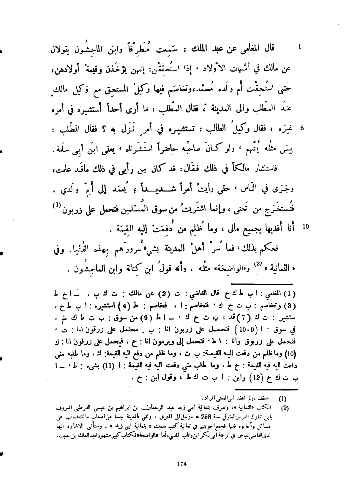 فقال وكيل الطالب: تستشيره في أمر نزل به؟ فقال المطلب ليس مثله يتهم، ولو كان صاحبه حاضراً يعني ابن أبي سلمة استشرناه، فاستشار مالكاً في ذلك، فقال: قد كان رأيي في ذلك ما قد علمت وجرى في الناس حتى رأيت أمراً شديداً يعمد إلى أم ولدي، فتستخرج من تحتي وإنما اشتريت من سوق المسلمين، فيحمل علي رزقها أما أفديها بجميع مالي وما ظلم من دفع إليه القيمة.