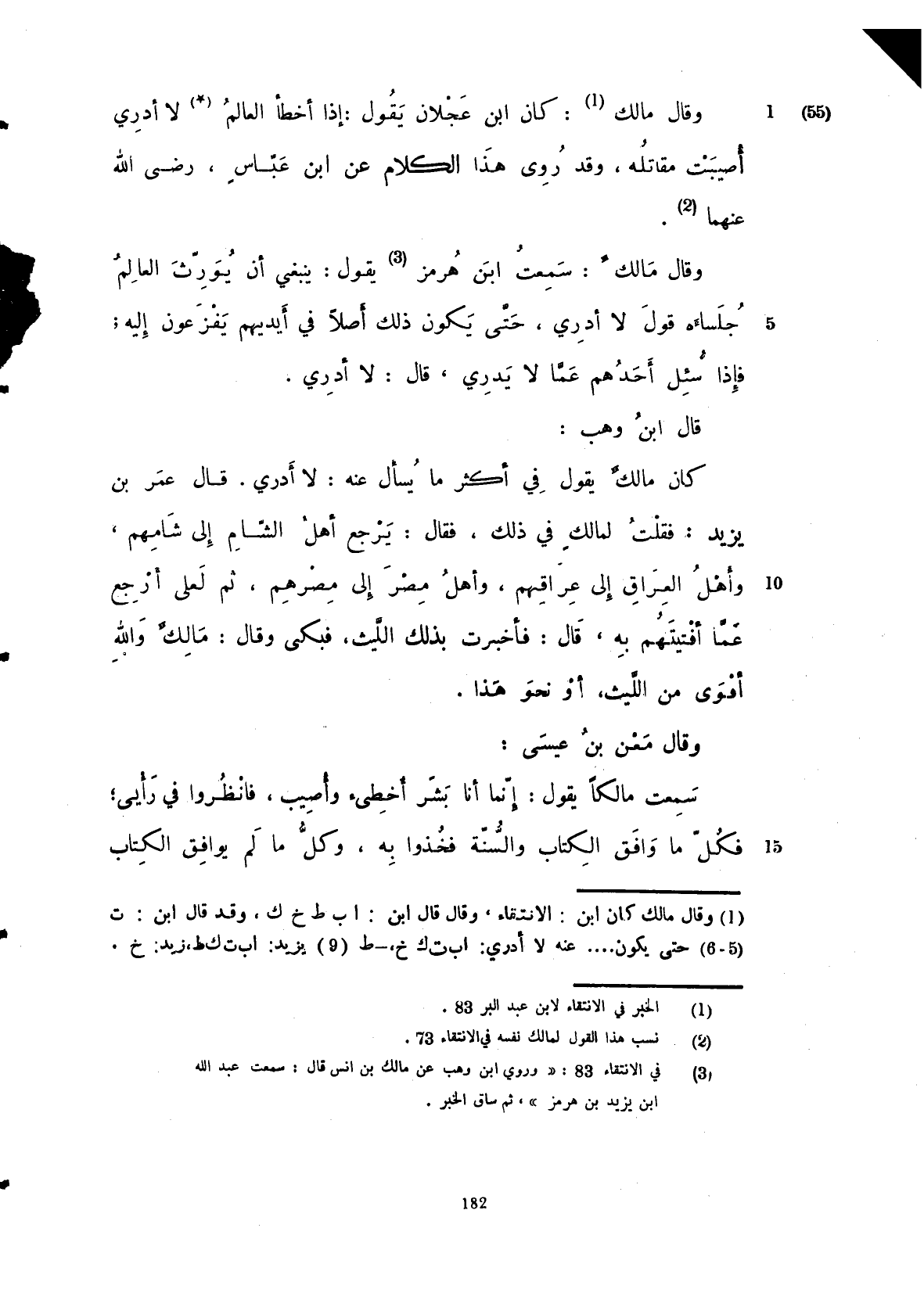 وقال مالك: سمعت ابن هرمز يقول: ينبغي أن يورث العالم جلساءه قول لا أدري حتى يكون ذلك أصلاً في أيديهم يفزعون إليه، فإذا سئل أحدهم عما لا يروي قال لا أدري.