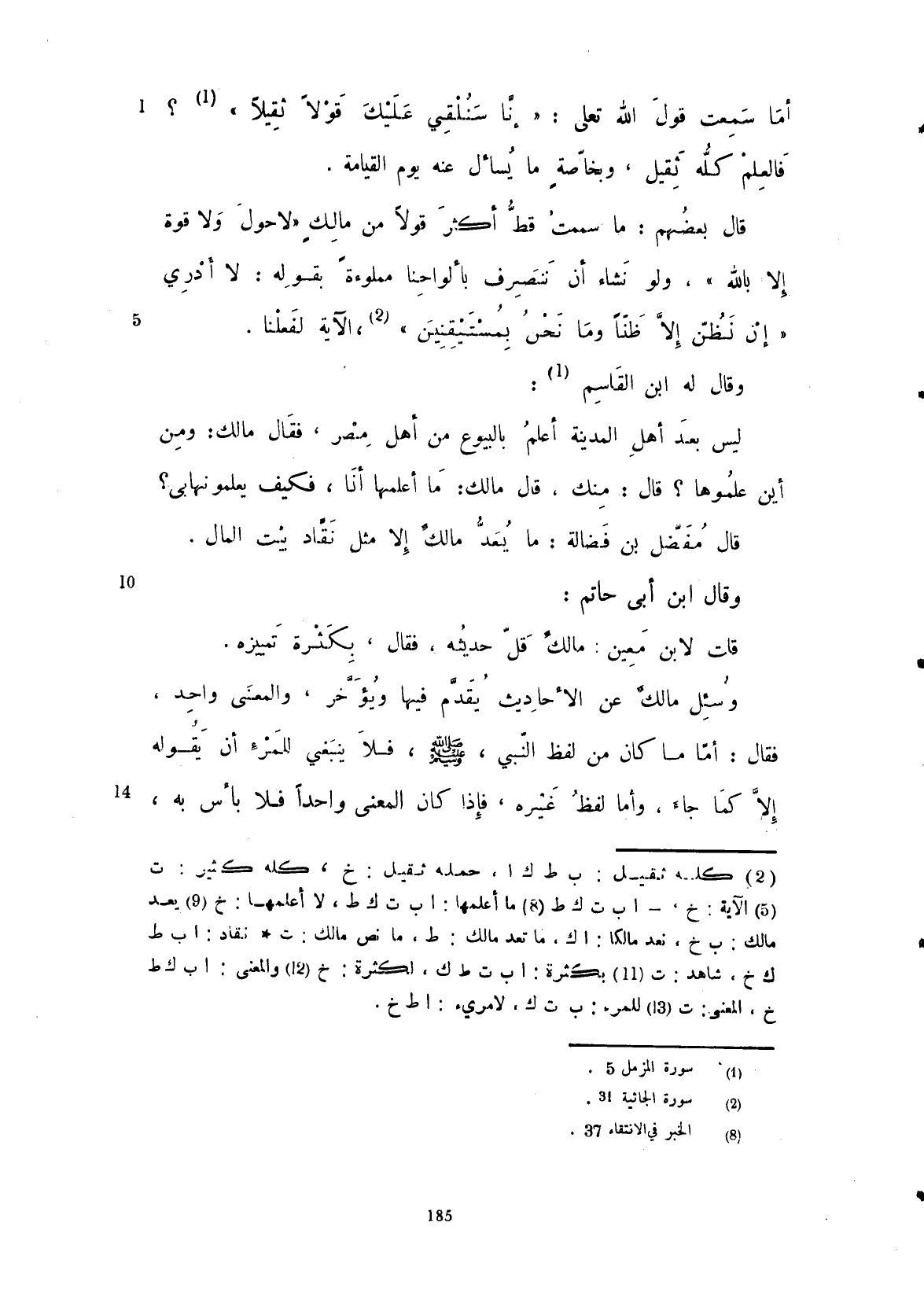 قال مالك: ما أعلمها أنا فكيف يعلمونها؟ قال مفضل بن فضالة: ما نعد مالكاً إلا مثل نقاد بيت المال.