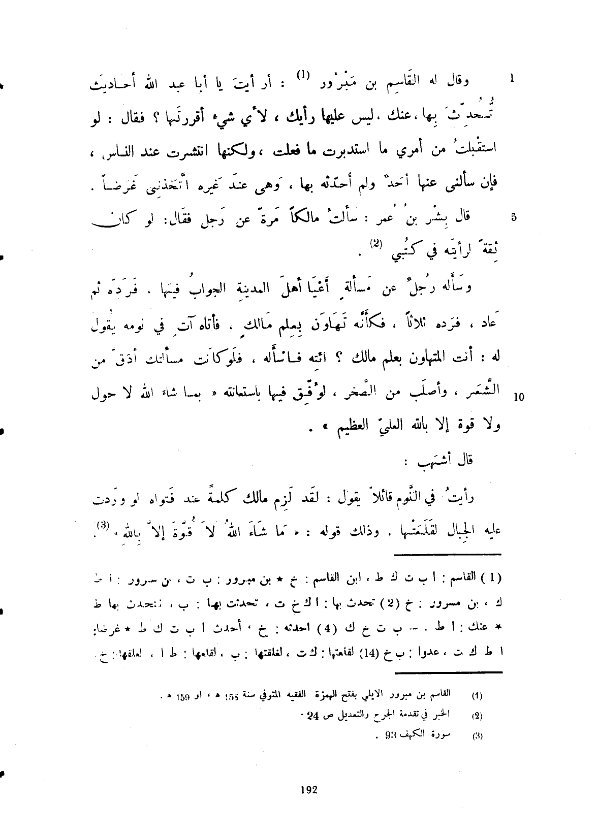 فرده ثم عاد فرده ثلاثاً فكأنه تهاون بعلم مالك فأتاه أت في نومه يقول له: أنت المتهاون بعلم مالك؟ ائته فأسأله فلو كانت مسألتك أدق من الشعر وأصلب من الصخر لوفق فيها باستعانته بما شاء الله لا حول ولا قوة إلا بالله العلي العظيم.