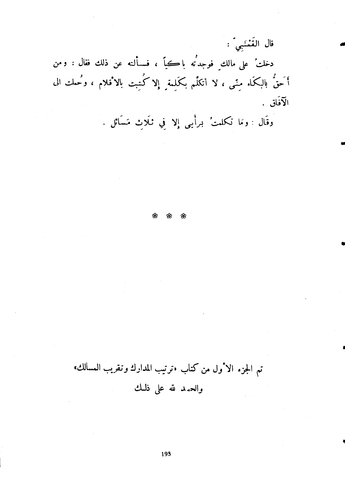 قال القعنبي دخلت على مالك فوجدته باكياً فسألته عن ذلك فقال ومن أحمق بالبكاء مني لا أتكلم بكلمة إلا تبت بالأقلام وحملت إلى الآفاق وما تكلمت برأي إلا في ثلاث مسائل.