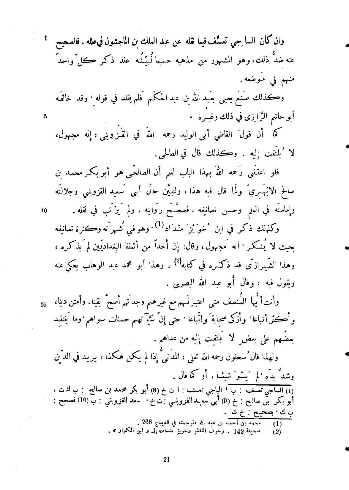 وكذلك صنع يحيى بعبد الله ابن عبد الحكم فلم يقلد في قوله، وقد خالفه أبو حاتم الرازي في ذلك وغيره كما أن قول القاضي أبي الوليد رحمه الله في القزويني أنه مجهول غير ملتفت إليه وكذلك قال في الصالحي فلو اعتنى رحمه الله بهذا الباب لعلم أن الصالحي هو أبو بكر محمد بن صالح الأبهري، ولما قال فيه هذا ولنفى حال أبي سعيد القزويني وجلالته وإمامته في العلم، وحسن تصانيفه فصحح روايته ولم يرتب في نقله وكذلك ذكر في ابن خويز منداد وهو في شهرته وكثرة تصانيفه حيث لا يذكر أنه مجهول، وقال أن أحداً من أيمتنا البغداديين لم يذكروه، وهذا الشيرازي قد ذكره في كتابه وهذا أبو محمد عبد الوهاب يحكي عنه ويقول فيه، وقال أبو عبد الله البصري وأنت أيها المنصف متى اعتبرتهم مع غيرهم وجدتهم أصح يقيناً وأمتن ديناً وأكثر أتباعاً وأزكى صحابة وأتباعاً حتى أن سيئاتهم حسنات سواهم، وما ينتقد بعضهم على بعض لا يلتف إليه من عداهم، ولهذا قال سحنون رحمه الله: المدني إذا لم يكن هكذا.