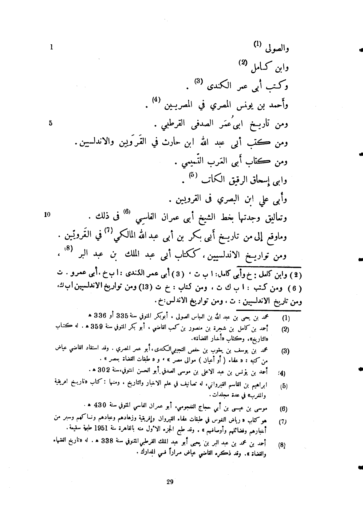 والصولي وأبي كامل وكتاب أبي عمر الكندي، وأحمد بن يونس المصري في المصريين ومن تاريخ أبي عمر الصدفي القرطبي، ومن كتب أبي عبد الله بن حارث في القرويين والأندلسيين ومن كتب أبي العرب التميمي، وأبي إسحاق الرقيق الكاتب، وأبي علي بن البصري في القرويين وتعاليق وجدتها بخط الشيخ أبي عمران الفاسي في ذلك، وما وقع إلي من تاريخ أبي بكر بن أبي عبد الله المالكي في القرويين ومن تواريخ الأندلس ككتاب أبي عبد الملك بن عبد البر