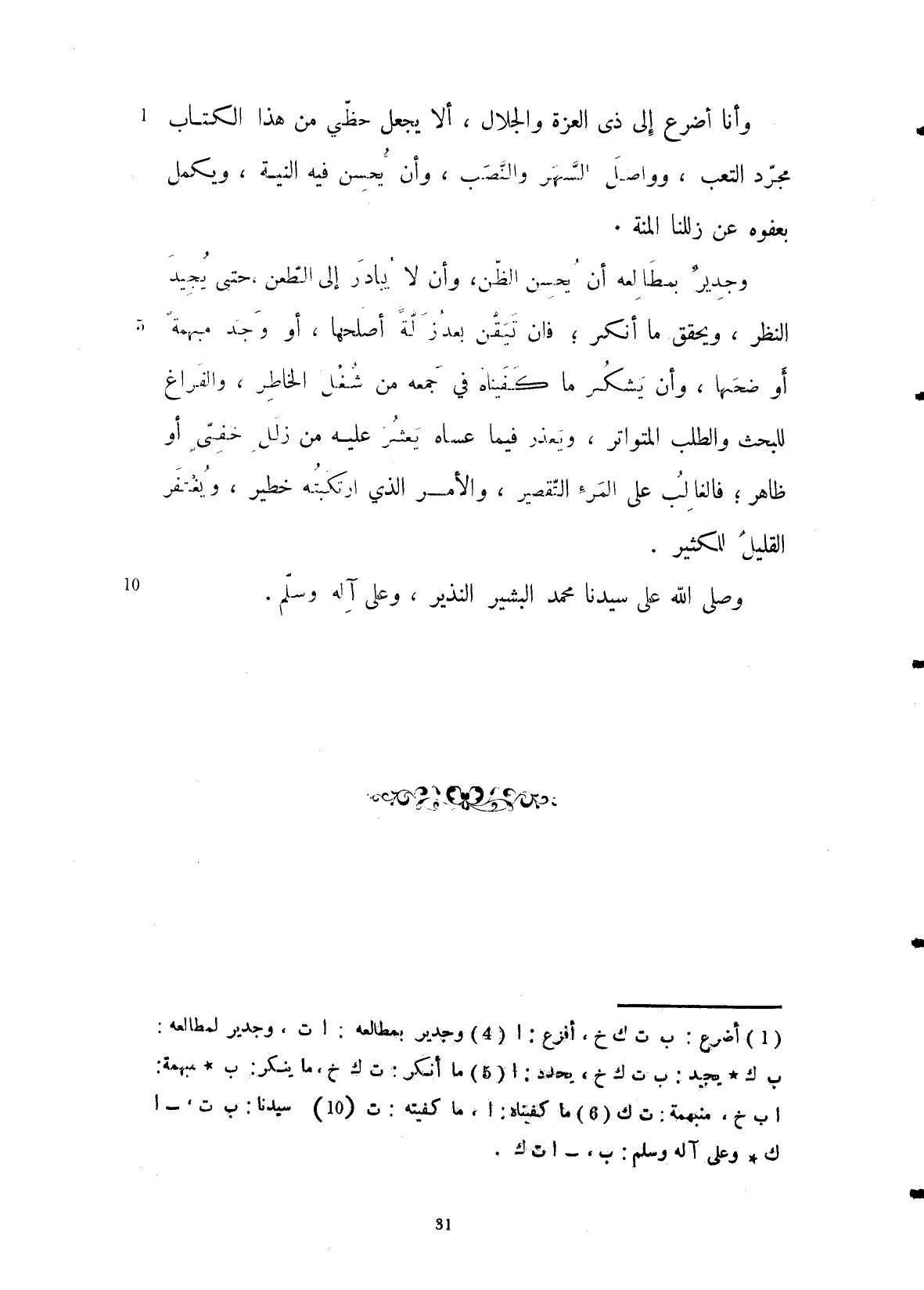 وأنا أضرع إلى ذي العزة والجلال أن لا يجعل حظي من هذا الكتاب مجرد التعب والسهر والنصب، وأن يحسن فيه النية ويكمل بعفوه عن زللنا المنة، وجدير لمطالعه أن يحسن الظن ولا يبادر إلى الطعن حتى يجيل النظر ويحقق ما أنكر، فإن تيقن بعد ذلة أصلحها أو وجد مبهمة أوضحها وأن يشكر ما كفيناه في جمعه من شغل الخاطر والفراغ للبحث والطلب المتواتر، ويعذر فيما عساه يعثر عليه من زلل خفي، أو ظاهر، فالغالب على المرء التقصير والأمر الذي ارتكبته خطير، ويفتقر القليل للكثير وصلى الله على سيدنا محمد البشير النذير.