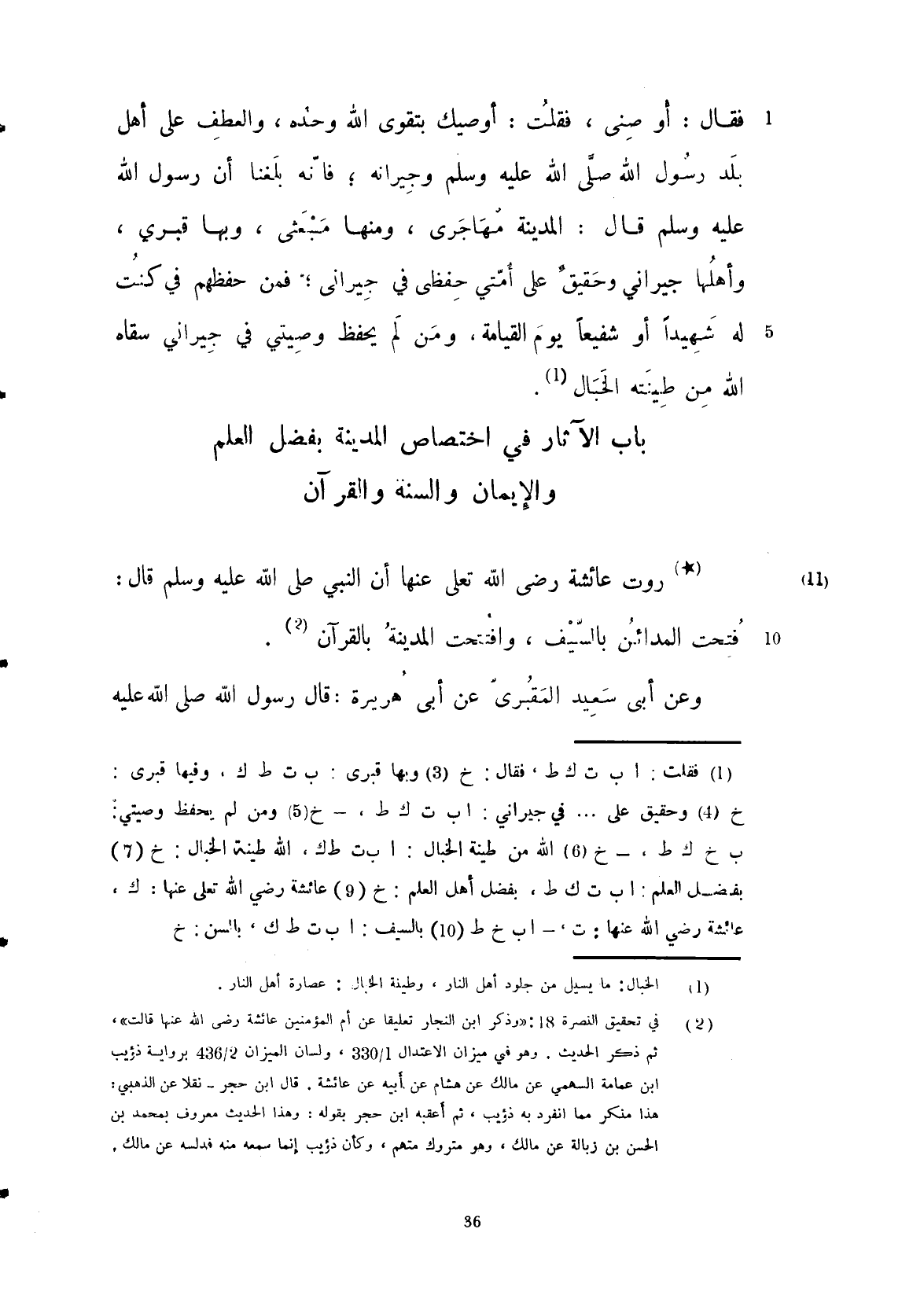 فقال أوصني فقلت أوصيك بتقوى الله وحده والعطف على أهل بلد رسول الله صلى الله عليه وسلم وجيرانه، فإنه بلغنا أن رسول الله صلى الله عليه وسلم قال: المدينة مهاجري ومنها مبعثي وبها قبري وأهلها جيراني وحقيق على أمتي حفظي في جيراني فمن حفظهم بي كنت له شهيداً وشفيعاً يوم القيامة ومن لم يحفظ وصيتي في جيراني سقاه الله من طينة الخبال.