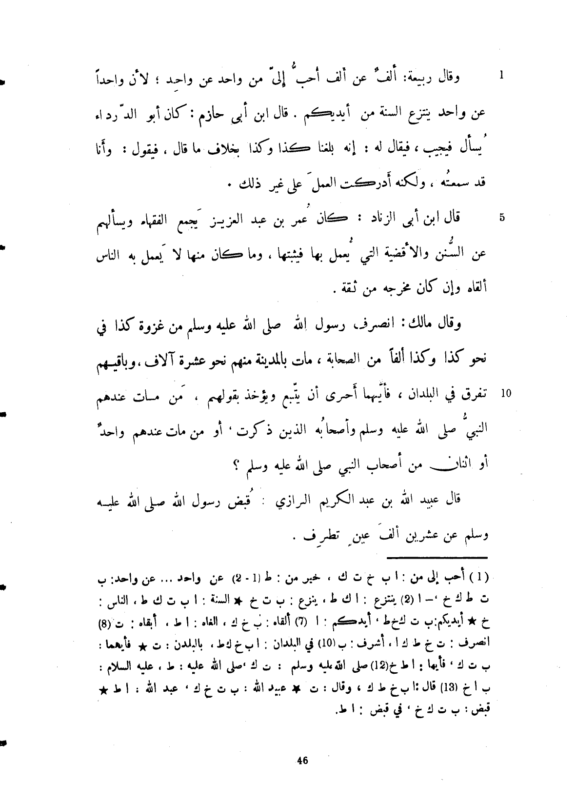 فيقول: وأنا قد سمعته ولكني أدركت العمل على غير ذلك، قال ابن أبي الزناد كان عمر بن عبد العزيز يجمع الفقهاء ويسألهم عن السنن والأقضية التي يعمل بها فيثبتها وما كان منه لا يعمل به الناس ألغاه، وإن كان مخرجه من ثقة، وقال مالك: انصرف رسول الله صلى الله عليه وسلم من غزوة كذا في نحو كذا، وكذا ألفاً من الصحابة، مات بالمدينة منهم نحو عشرة آلاف وباقيهم تفرق بالبلدان فأيهما أحرى أن يتبع ويؤخذ بقولهم؟ من مات عندهم النبي صلى الله عليه وسلم وأصحابه الذين ذكرت؟ أو مات عندهم واحد أو اثنان من اصحاب النبي صلى الله عليه وسلم؟ قال عبيد الله بن عبد الكريم: قبض رسول الله صلى الله عليه وسلم عن عشرين ألف عين تطرف.