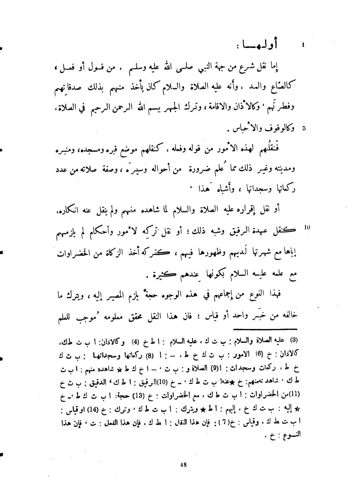 أولها ما نقل شرعاً من جهة النبي صلى الله عليه وسلم من قول كالصاع والمد، وانه عليه الصلاة والسلام كان يأخذ منهم بذلك صدقاتهم وفطرتهم، وكالأذان والإقامة وترك الجهر بسم الله الرحمن الرحيم الله الرحمان الرحيم في الصلاة والوقوف (والأحباس) فتقلهم لهذه الأمور من قوله وفعله كنقلهم موضع قبره ومسجده ومنبره ومدينته وغير ذلك مما علم ضرورة من أحواله وسيره وصفة صلاته من عدد ركعاتها وسجداتها وأشباه هذا، أو نقل إقراره عليه السلام لما شاهده منهم ولم ينقل عنه إنكاره كنقل عهده الرقيق وشبه ذلك، أو نقل تركه لأمور وأحكام لم يلزمهم إياها مع شهرتها لديهم وظهورها فيهم كتركه أخذ الزكاة من الخضروات مع علمه عليه السلام بكونها عندهم كثيرة، فهذا النوع من إجماعهم في هذه الوجوه حجة يلزم المصير إليه ويترك ما خالفه من خبر واحد أو قياس، فإن هذا النقل محقق معلوم موجب للعلم
