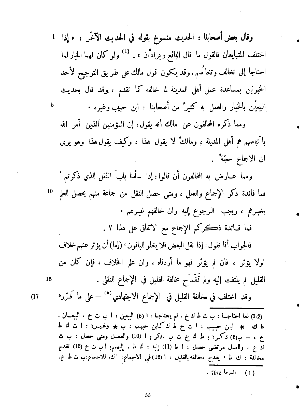 وكيف يقوله وهو يرى أن الإجماع حجة ومما عارض به المخالف أن قالوا إذا سلمنا باب النقل الذي ذكرتم فما فائدة الإجماع والعمل؟ ومتى حصل النقل عن جماعة يحصل العلم بخبرهم وجب الرجوع إليه وإن خالفهم غيرهم فما فائدة ذكرهم الإجماع مع الاتفاق على هذا؟ فالجواب أنا نقول: إذا نقل البعض فلا يخلو الباقون أن يؤثر عنهم خلاف أو لا يؤثر، فإن لم يؤثر فهو ما أردناه، وإن علم الخلاف فإن كان من القليل لم يلتفت إليه ولم يقدح مخالفة القليل في الإجماع النقلي، وقد اختلف في مخالفة القليل فالإجماع الإجماع على ما قرره