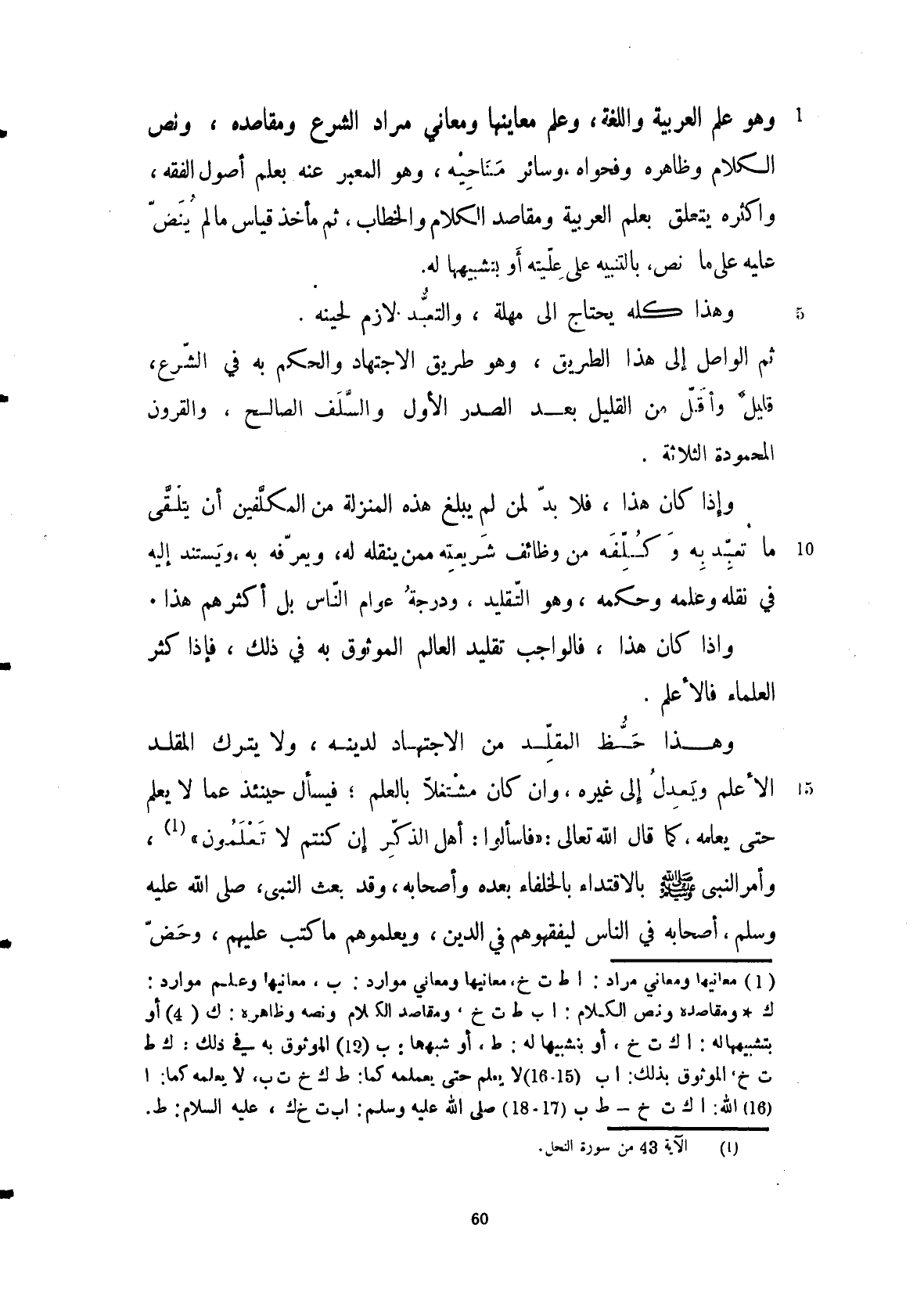 وهذا كله يحتاج إلى مهلة والتعبد لازم لحينه، ثم إن الواصل إلى هذا الطريق وهو طريق الاجتهاد والحكم به في الشرع قليل وأقل من القليل بعد الصدر الأول والسلف الصالح والقرون المحمودة الثلاثة وإذا كان هذا فلا بد لمن لم يبلغ هذه المنزلة من المكلفين أن يتلقى ما تعبد به وكلف به من وظائف شريعته ممن ينقله له ويعرفه به ويثبته عليه في نقله وعلمه وحكمه وهو التقليد ودرجة عوام الناس بل أكبرهم هذا، وإذا كان هذا فالواجب تقليد العالم لموثوق بذلك، فإذا كثر العلماء فالأعلم وهذا حظ المقلد من الاجتهاد لدينه ولا يترك المقلد الأعلم ويعدل إلى غيره وإن كان يشتغل بالعلم فيسأل حينئذ عما لا يعلم حتى يعلمه.