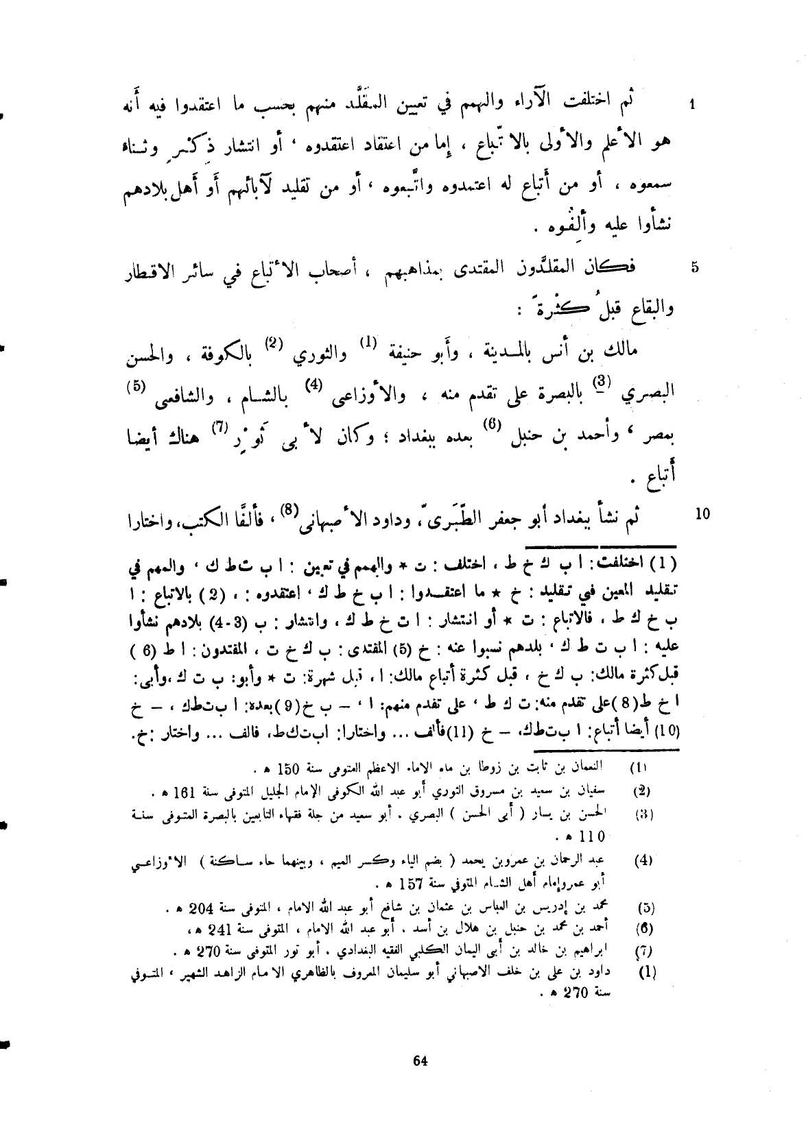 ثم اختلفت الآراء والهمم في تعيين المقلد منهم بحسب ما اعتقدوه فيه أنه هو الأعلم والأولى بالإتباع، أما من اعتقاد اعتقدوه أو انتشار ذكر وثناء سمعوه أو من اتباع له اعتمدوه أو من تقليد لآبائهم أو أهل بلادهم نشأوا عليه وألفوه، فكان المقلدون المقتدى بمذاهبهم أصحاب الأتباع في سائر الأقطار البقاع كثرة قبل مالك بن أنس بالمدينة وأبو حنيفة والثوري بالكوفة، والحسن البصري بالبصرة على ما تقدم منه، والأوزاعي بالشام، والشافعي بمصر، وأحمد بن حنبل (بعده) ببغداد وكان لأبي ثور هناك أيضاً أتباع.