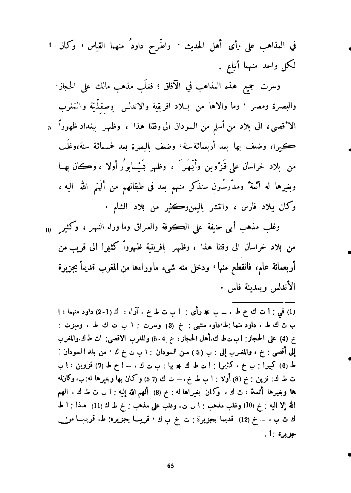 في المذاهب على آراء أهل الحديث واطرح داود منها القياس وكان لكل واحد منهما أتباع، وسرت جميع هذه المذاهب في الآفاق فغلب مذهب مالك على الحجاز والبصرة ومصر وما والاها من بلاد أفريقية والأندلس وصقلية والمغرب الأقصى إلى بلاد من أسلم من السودان إلى وقتنا هذا وظهر ببغداد ظهوراً كثيراً وضعف بها بعد أربعمائة سنة وضعف بالبصرة بعد خمسمائة سنة وغلب من بلاد خراسان على قزوين وأبهر وظهر بنيسابور وكان با وبغيرها أئمة ومدرسون سنذكر منهم بعد في طبقاتهم من ألهم الله تعالى إليه، وكان ببلاد فارس وانتشر باليمن وكثير من بلاد الشام، وغلب مذهب أبي حنيفة على الكوفة والعراق وما وراء النهر وكثير من بلاد خراسان إلى وقتنا وظهر بإفريقية ظهوراً كثيراً إلى قريب من أربعمائة عام فانقطع منها ودخل منه شيء ما وراءها من المغرب قديماً بجزيرة الأندلس وبمدينة فاس