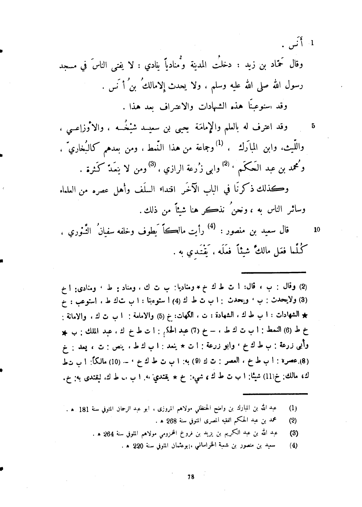 أنس، قال حماد بن زيد: دخلت المدينة ومنادياً ينادي لا يفتي الناس في مسجد رسول الله صلى الله عليه وسلم ويحدث إلا مالك بن أنس، وقد استوعبنا هذه الشهادات والاعتراف بعد هذا، وقد اعترف له بالعلم والإمامة يحيى بن سعيد شيخه والأوزاعي والليث وابن المبارك وجماعة من هذا النمط ومن بعدهم كالبخاري ومحمد بن عبد الحكم وأبو زرعة الرازي ومن لا ينعد كثرة.