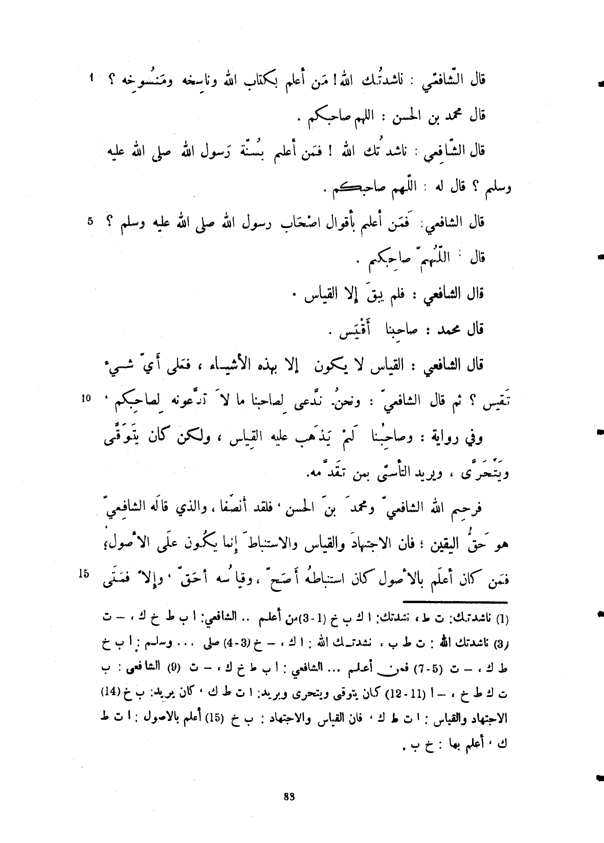 قال الشافعي ناشدتك الله فمن أعلم بكتاب الله وناسخه ومنسوخه قال محمد ابن الحسن: اللهم صاحبكم، فقال الشافعي: فمن أعلم بسنة رسول الله صلى الله عليه وسلم قال اللهم صاحبكم، قال الشافعي فمن أعلم بأقوال أصحاب رسول الله صلى الله عليه وسلم قال اللهم صاحبكم، قال الشافعي فلم يبق إلا القياس.