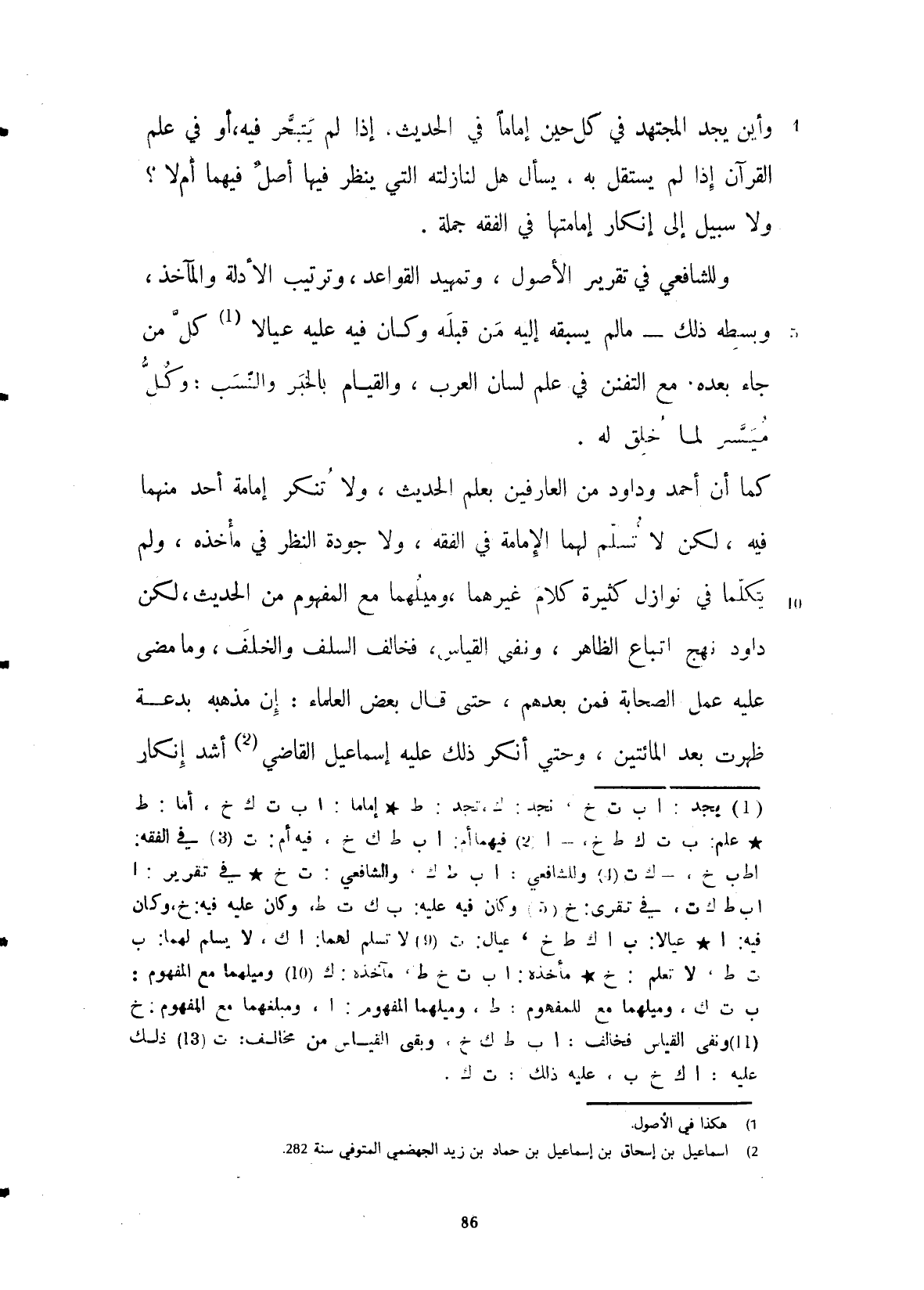 إذا لم يتبحر فيه أو في علم القرآن إذا لم يستقل به، يسأل هل لنازلته التي ينظر فيها أصل فيهما أم لا؟ ولا سبيل إلى إمامتهما (في الفقه) جملة، وللشافعي في تقرير الأصول وتمهيد القواعد وترتيب الأدلة والمآخذ وبسطه ذلك ما لم يسبقه إليه من قبله، وكان فيه عليه عيالاً، كل من جاء بعده مع التفنن في علم لسان العرب والقيام بالخبر والنسب، وكل ميسر لما خلق له.