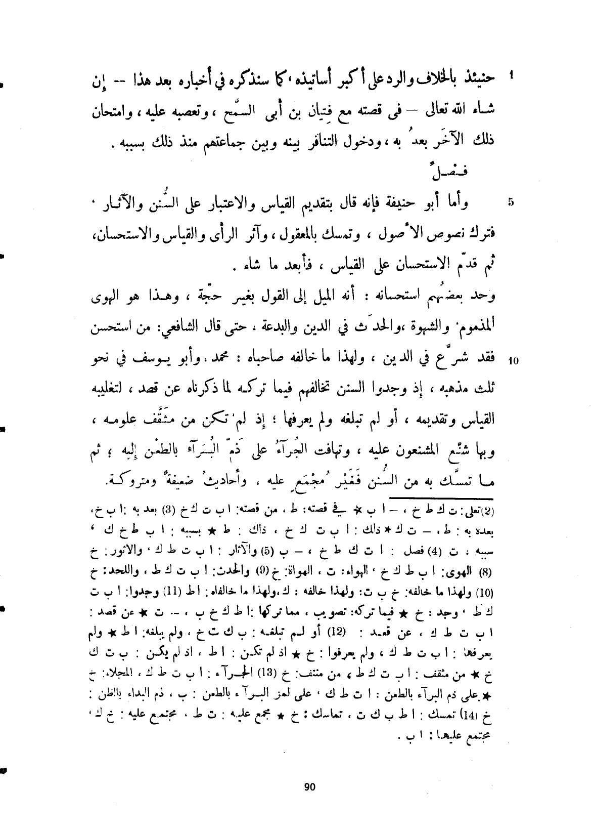 (فصل) وأما أبو حنيفة فإنه قال بتقديم القياس والاعتبار على السنن والآثار، فترك نصوص الأصول وتمسك بالمعقول وآثر الرأي والقياس والاستحسان، ثم قدم الاستحسان على القياس فأبعد ما شاء.