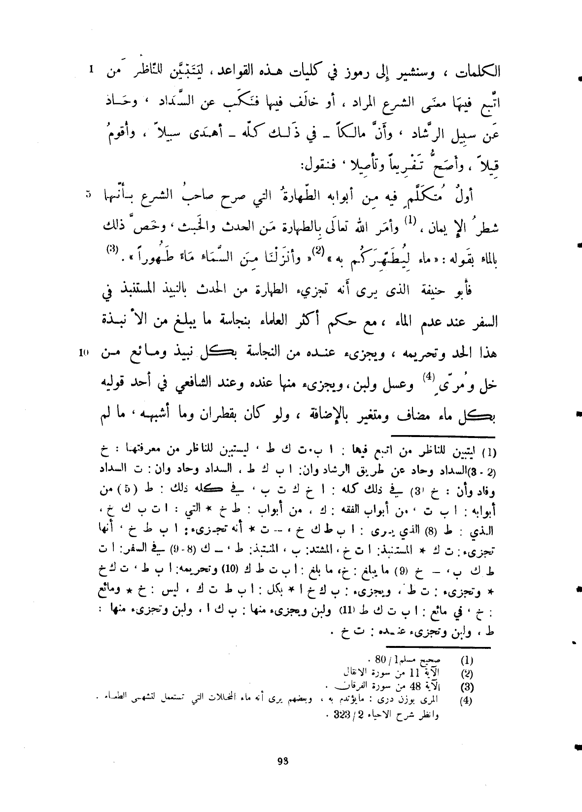 فنقول أول ما تكلم فيه من أبوابه الطهارة التي صرح صاحب الشرع بأنها شطر الإيمان وأمر الله تعالى بالطهارة من الحدث والخبث وخص ذلك بالماء بقوله: (ماء ليطهركم به) (وأنرلنا من السماء ماء طهوراً) .