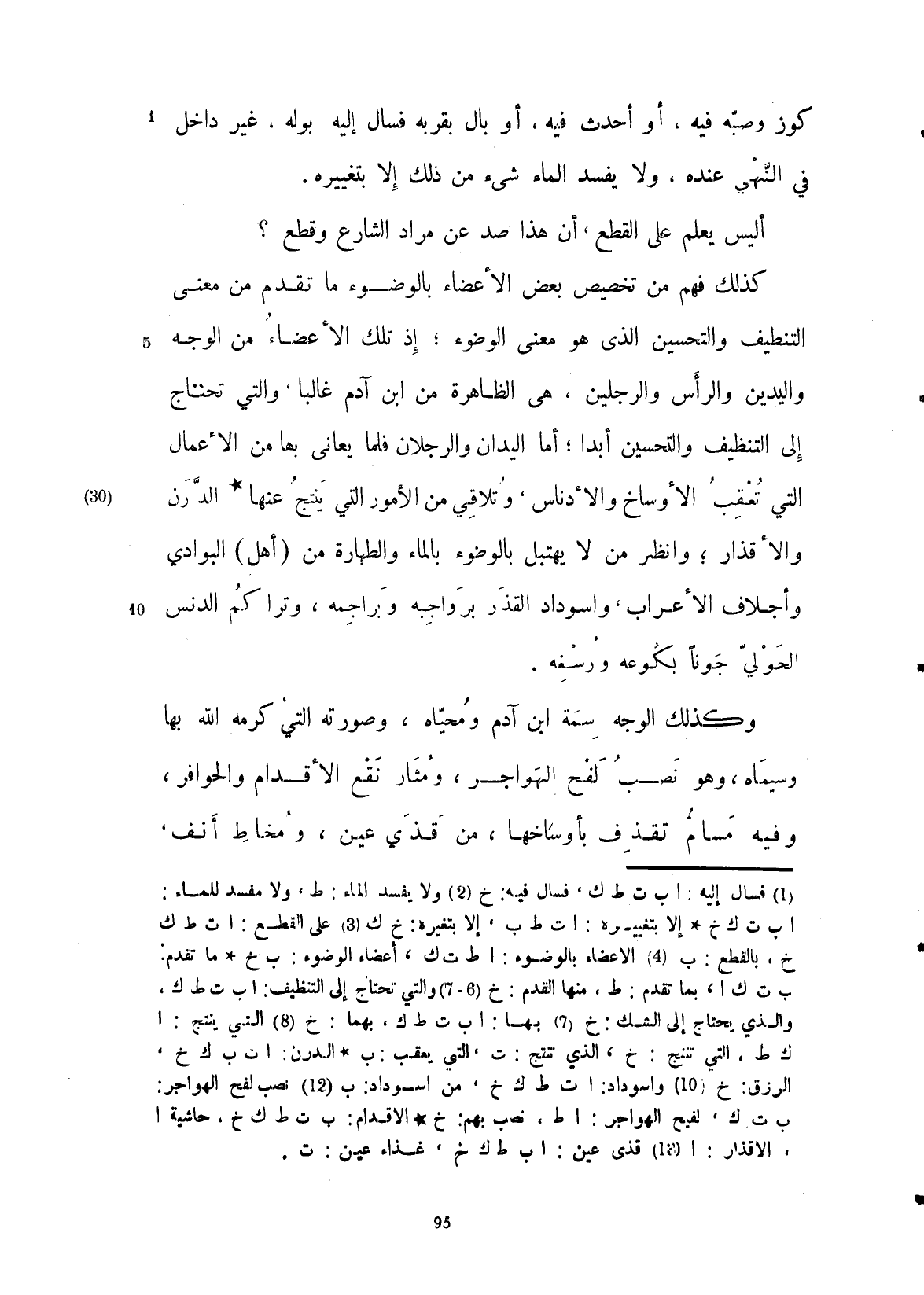 إذ تلك الأعضاء من الوجه واليدين والرأس والرجلين هي الطهارة من ابن آدم غالباً والتي تحتاج إلى التنظيف والتحسين أبداً أما اليدان والرجلان فلما يعاني بها من الأعمال التي تعقب الأدناس والأوساخ وتلاقي من الأمور التي تنتج عنها الدرن والأقذار، وانظر من لا يهتبل بالوضوء والماء والطهارة من البوادي وأجلاف الأعراب واسوداد القذر بروائحه وبراجمه وتراكم الدنس الموالي جوفاً بكوعه ورسغه، وكذلك الوجه سمة ابن آدم ومحياه وصورته التي كرمه الله بها وسيماه وهو نصب لفح الهواجر، ومثار نقع الأقدام والحوافر وفيه مسام تقذف بأوساخها من قذاء عين ومخاط أنف
