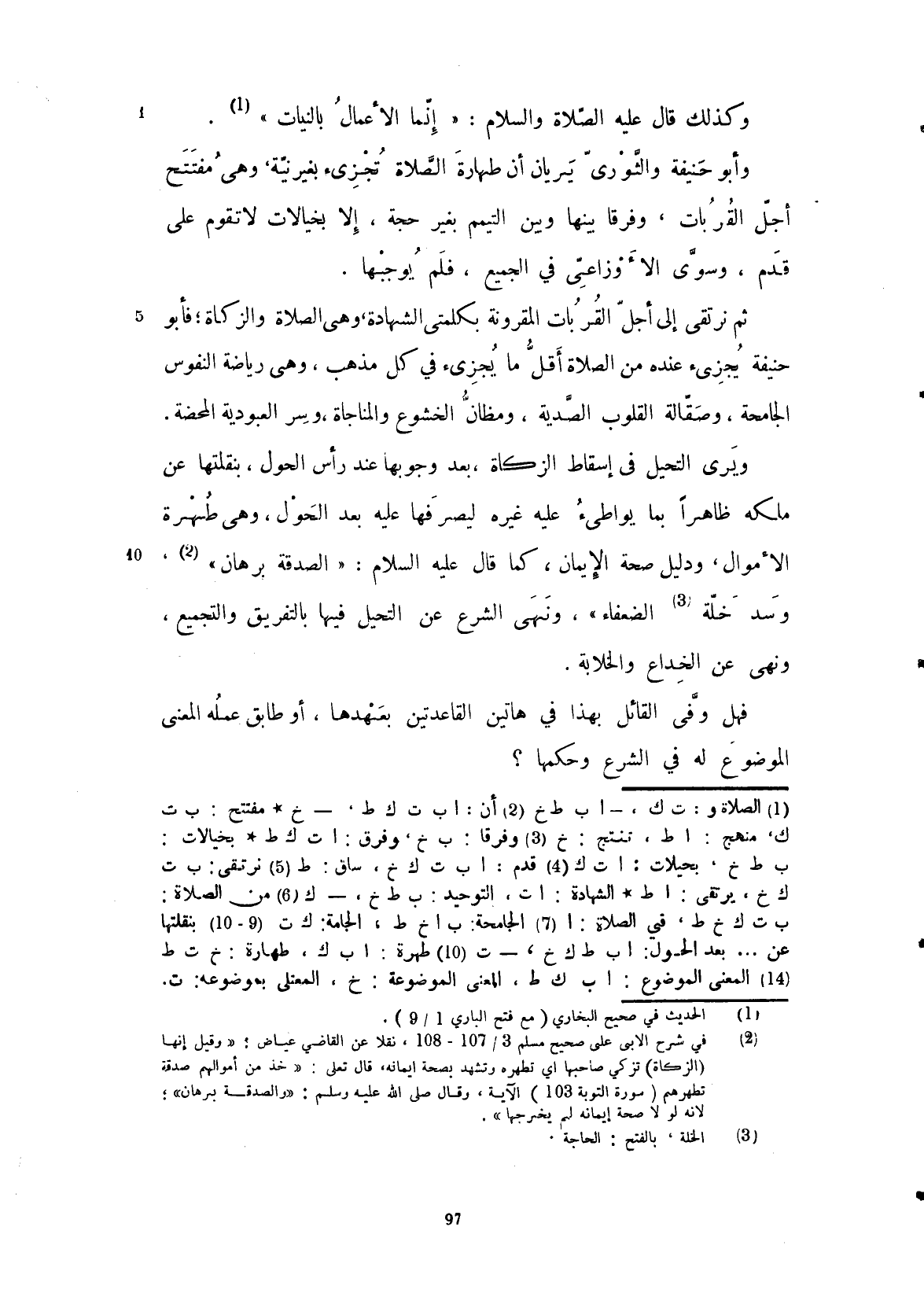 ترتقي إلى أجل القربات المقرونة بكلمتي التوحيد وهي الصلاة والزكاة وأبو حنيفة يجزي عنده من الصلاة أقل ما يجزي في كل مذهب وهي رياضة النفوس الجامة وصقالة القلوب الصدية ومظان الخشوع والمناجاة وسر العبودية المحضة ويرى التحيل في إسقاط الزكاة بعد وجوبها عند رأس الحول يبعدها عن ملكه ظاهراً بما يوطىء عليه غيره، ليصرفها عليه بعد الحول، وهي طهارة الأموال ودليل صحة ألإيمان كما قال عليه السلام: الصدقة برهان وسد خلة الضعفاء.