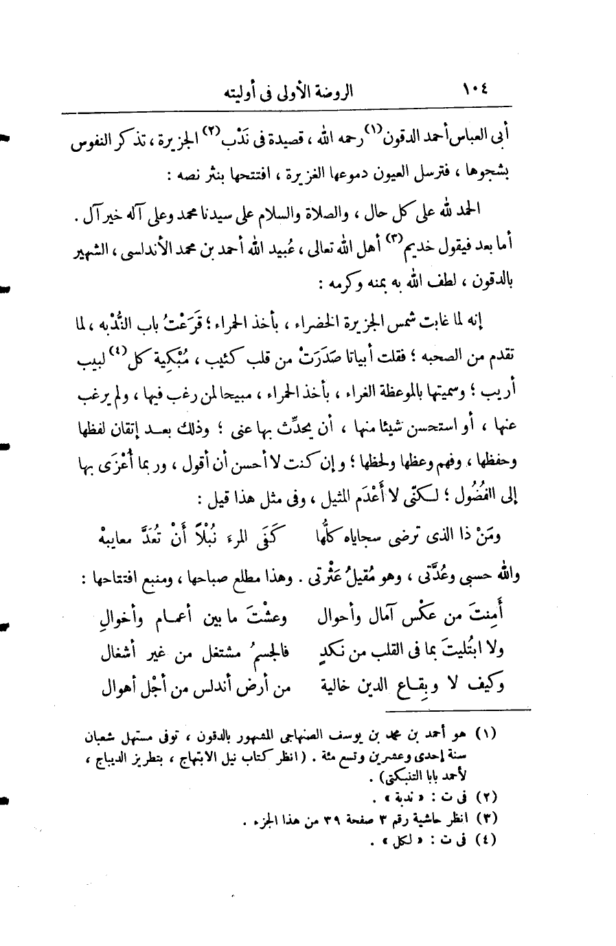 أبي العباس أحمد الدقون رحمه الله قصيدة في ندب الجزيرة تذكر النفوس بشجوها فترسل العيون دموعها الغزيرة افتتحها نصه: الحمد لله على كل حال والصلاة والسلام على سيدنا محمّد وعلى آله خير آل أما بعد فيقول خديم أهل الله تعالى عبيد الله أحمد بن محمّد الأندلسي الشهير بالدقون لطف الله به بمنه وكرمه: إنه لمّا غابت شمس الجزيرة الخضراء بأخذ الحمراء قرعت باب الندبة لمّا تقدم من الصحبه فقلت أبيات صدرت من قلب كئيب مبكية كل لبيب أريب وسميتها بالموعضة الغراء بأخذ الحمراء مبيحا لمن رغب فيها ولم يرغب عنها أو استحسن شيئا منها أن يحدث بها عني وذلك بعد إتقان لفظها وحفظها وفهم وعظها ولحظها وإن كنت لا أحسن أن أقول وربما أعزى بها إلى الفضول لكني لا أعدم المثيل وفي مثل هذا قيل: