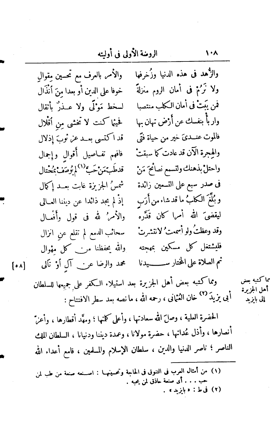 ومما كتبه بعض أهل الجزيرة بعد استيلاء الكفر على جميعها للسلطان أبي يزيد خان العثماني رحمه الله ما نصه بعد سطر الافتتاح: الحضرة العلمية وصل الله سعادتها وأعلى كلمتها ومهد أقطارها وأعز أنصارها وأذل عداتها حضرة مولانا وعمدة ديننا ودنيانا السلطان الملك الناصر ناصر الدين والدنيا سلطان الإسلام والمسلمين قامع أعداء الله
