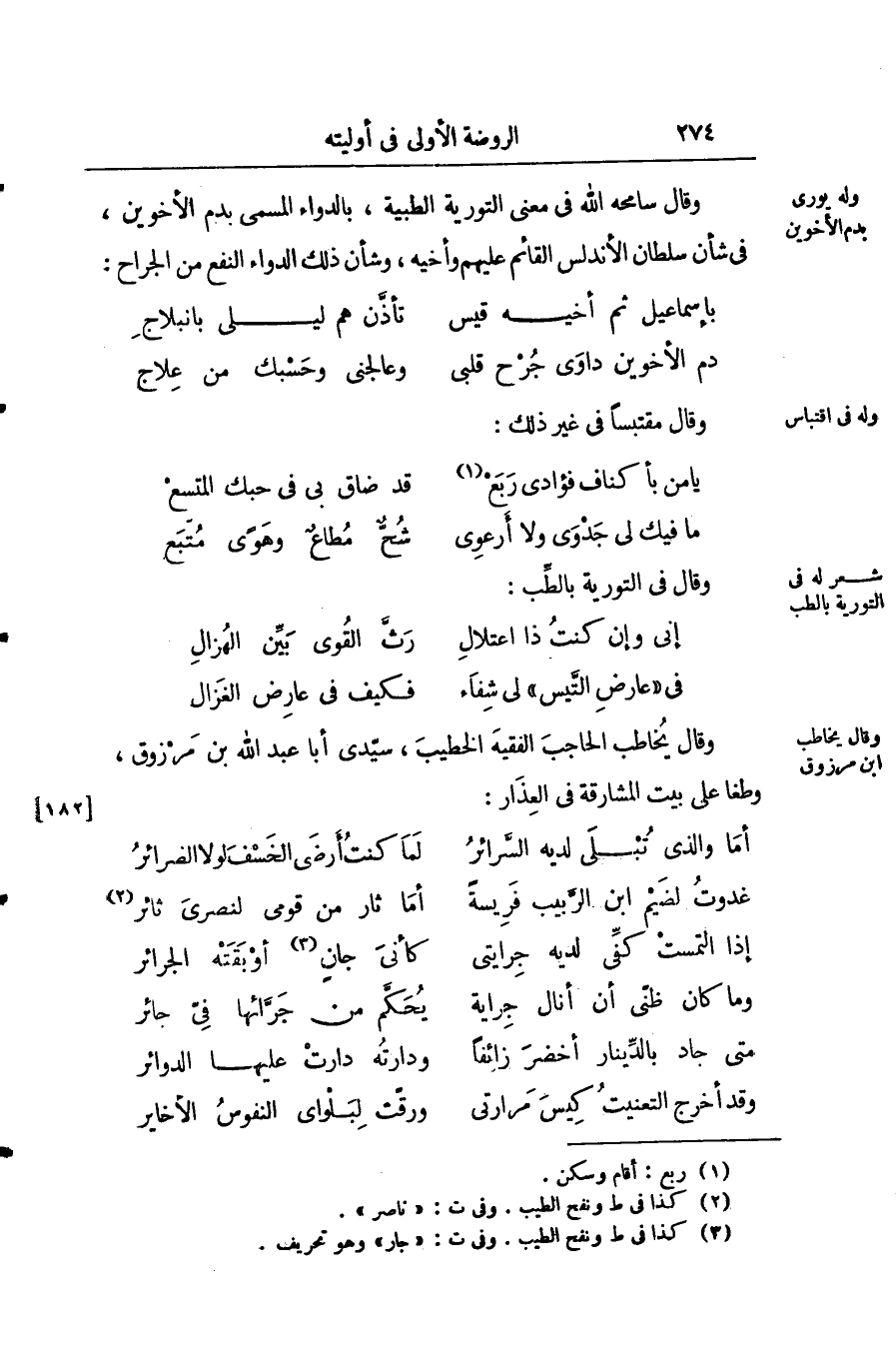 وقال سامحه الله في التورية الطيبة، بالدواء المسمى بدم الأخوين، في شأن سلطان الأندلس القائم عليهم وأخيه، وشان ذلك الدواء النفع من الجراح: