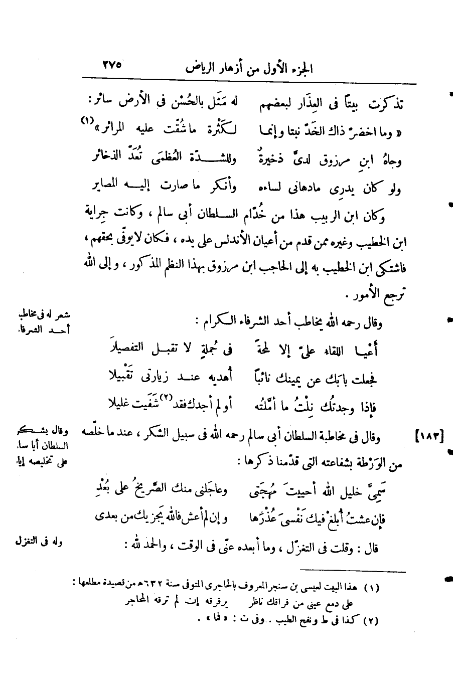 وكان أبن الربيب هذا من خدام السلطان أبي سالم، وكانت جارية أبن الخطيب وغيره ممن قدم من أعيان الأندلس على يده، فكان لا يوفي بحقهم، فاشتكى أبن الخطيب به إلى الحاجب أبن مرزوق بهذا النظم المذكور، إلى الله ترجع الأمور.