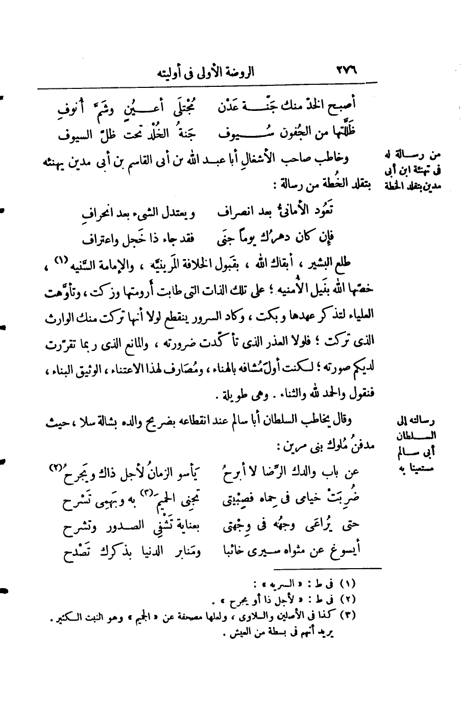 وقال يخاطب السلطان أبا سالم عند انقطاعه بضريح والده بشالة سلا، حيث مدفن ملوك بني مرين: