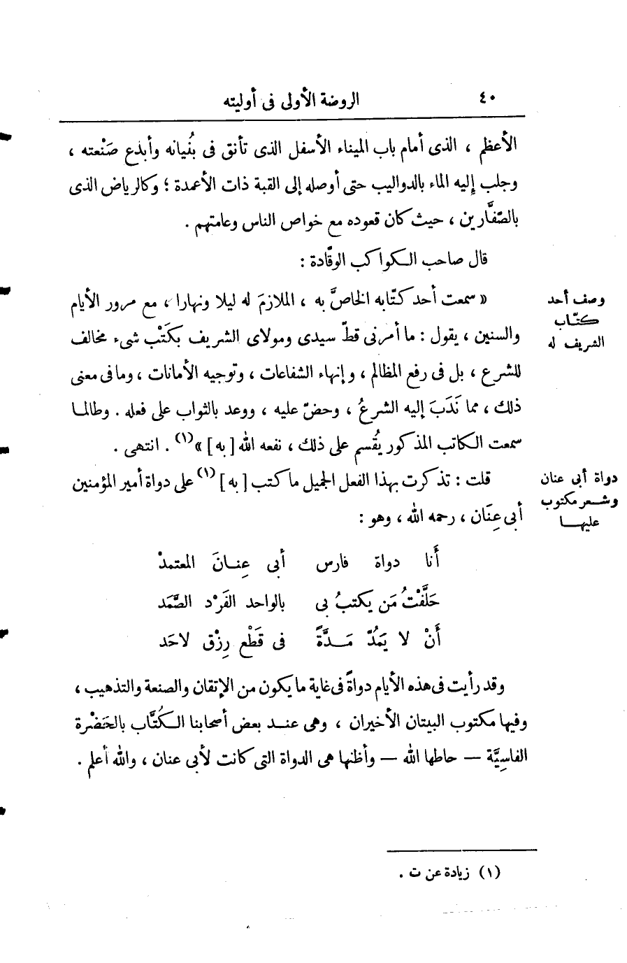وقد رأيت في هذا الأيام دواة في غاية ما يكون من الإتقان والصنعة والتذهيب، وفيها مكتوب البيتان الأخيران، وهي عند بعض أصحابنا الكتاب الحضرة الفاسية أحاطه الله وأظنها هي الدواة التي كانت لأبي عنان، والله اعلم.