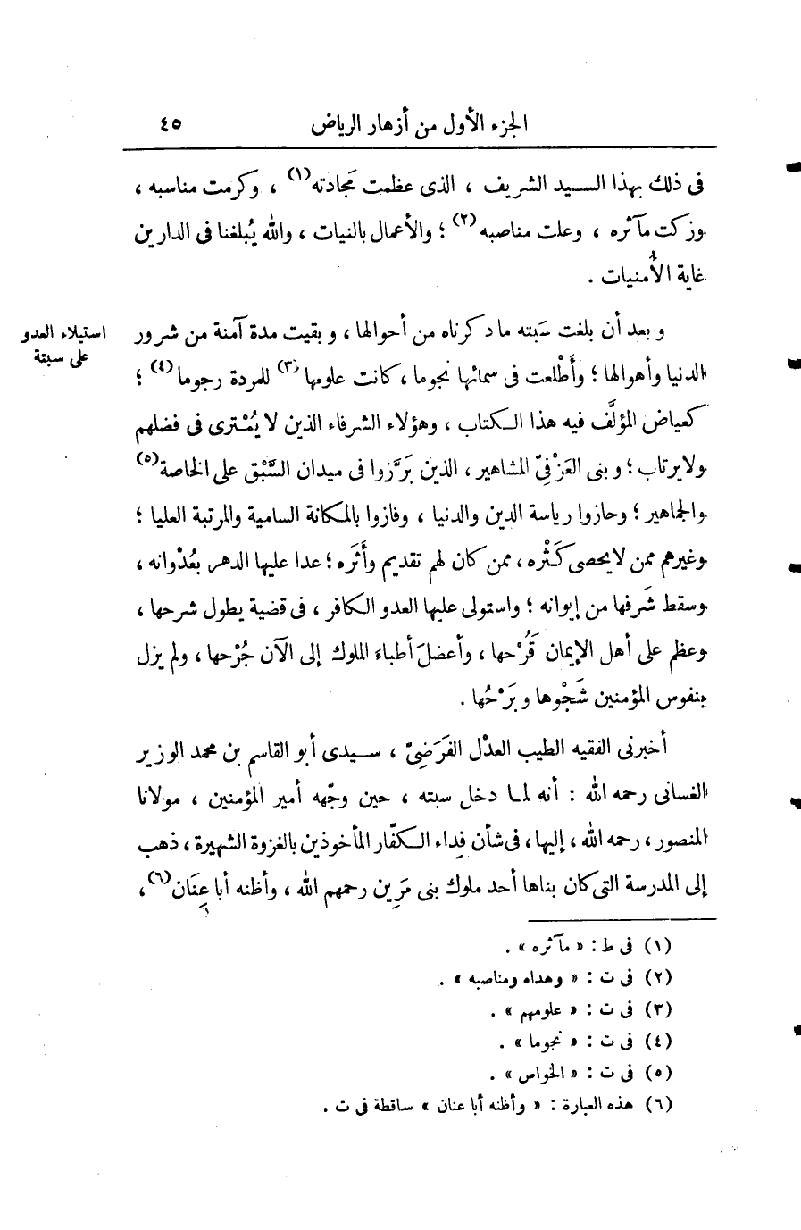 في ذلك بهذا السيد الشريف، الذي عظمت مجادته، وكرمت مناسبه، وزكت مآثره، وعلت مناصبه؛ والأعمال بالنيات، والله يبلغنا في الدارين غاية الأمنيات.