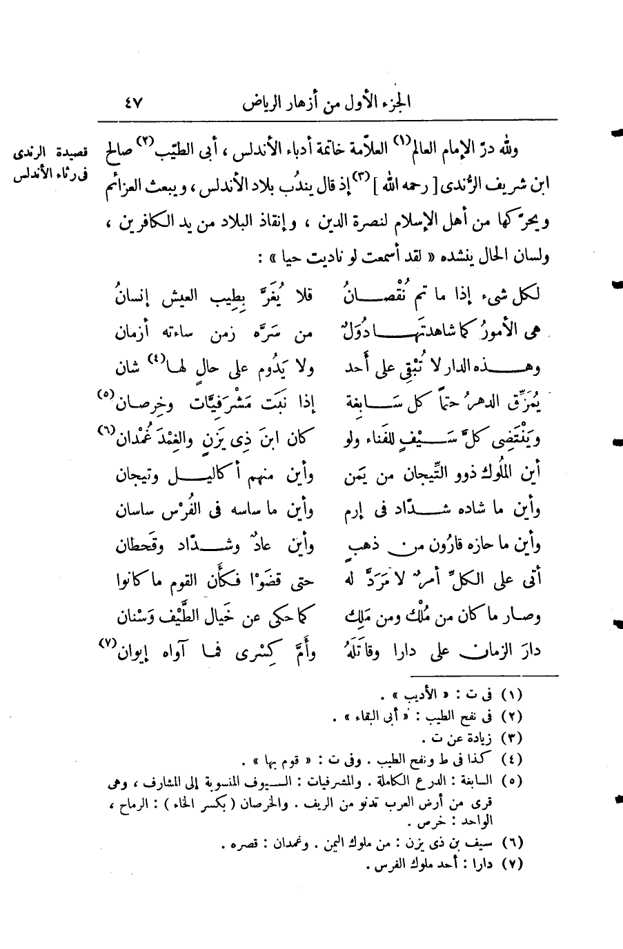 ولله در الإمام العلامة خاتمة أدباء الأندلس، أبي الطيب صالح أبن شريف الزندي رحمه الله إذ قال بلاد الأندلس، ويبعث العزائم ويحركها من أهل الإسلام لنصرة الدين، وإنقياد البلاد من يد الكافرين، ولسان الحال ينشده " لقد أسمعت لو ناديت حياً ".