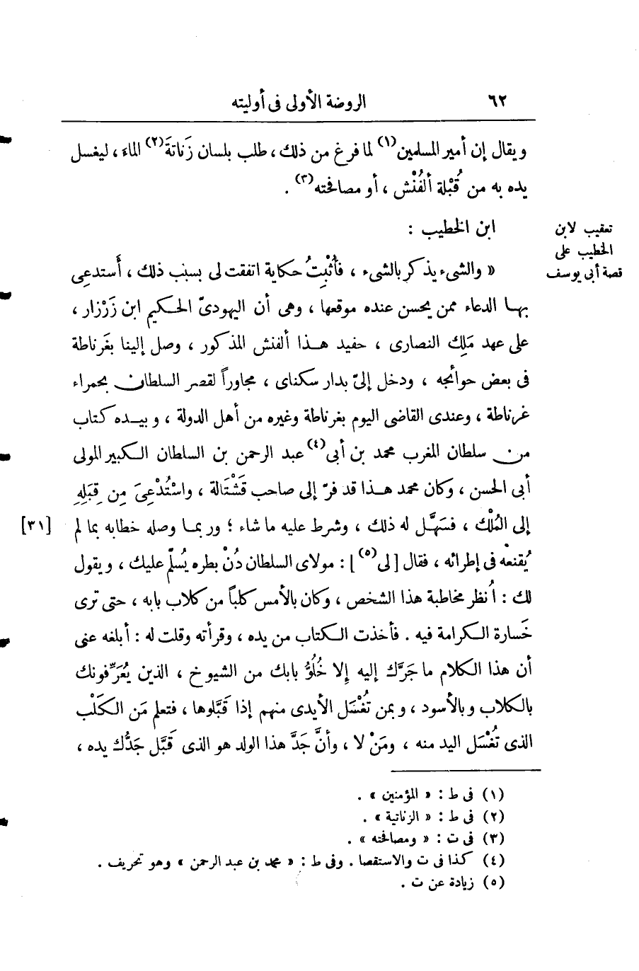 " والشيء يذكر بالشيء، فأثبت حكاية اتفقت بسبب ذلك، استدعى بها الدعاء ممن يحسن عنده موقعها، وهي أنَّ اليهودي الحكيم أبن زرزار، على عهد ملك النصارى، حفيد هذا الفنش المذكور، وصل إلينا بغرناطة في بعض جوائجه، وحخل إلى بدار سكناي، مجاوراً لقصر السلطان بحمراء غرناطة، وعندي القاضي اليوم بغرنطة وغيرها من أهل الدولة، وبيده كتاب من سلطان المغرب محمّد بن أبي عبد الرحمن بن السلطان الكبير المولى أبي الحسن، وكان محمّد هذا قد فر إلى صاحب قشتالة، واستدعى من قبله إلى الملك، فسهل له ذلك، وشرط عليه ما شاء، وربما وصله خطابه بما لم يقنعه في إطرائه، فقال لي: مولاي السلطان دن بطرة يسلم عليك، ويقول لك: انظر مخاطبة هذا الشخص، وكان بالأمس كلباً من كلاب بابه، حتى ترى خسارة الكرامة فيه، فأخذت الكتاب من يده، وقرأته وقلت له: ابلغه عني أنَّ هذا الكلام ما جرك إليه إلاّ خلو بابك من الشيوخ، الذين يعرفونك بالكلاب والأسود، وبمن تغسل الأيدي منهم إذا قبلوها، فتعلم من الكلب الذي تغسل اليد منه، ومن لا، وأنَّ جد هذا الولد هو الذي قبل جدك يده،