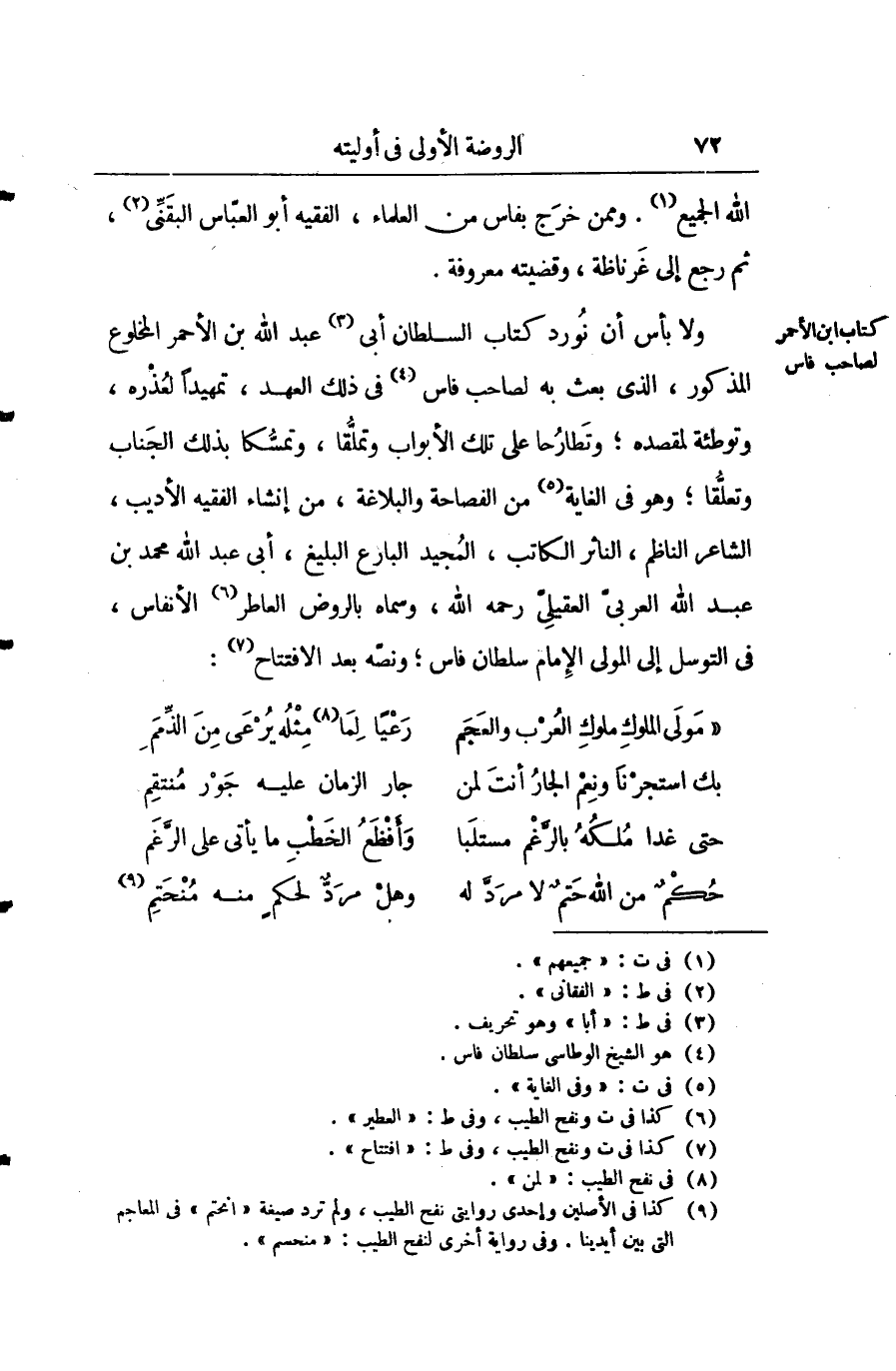 ولا بأس أن نورد كتاب السلطان أبي عبد الله محمّد بن الأحمر المخلوع المذكور الذي بعث به لصاحب فاس في ذلك العهد تمهيدا لعذره وتوطئة لمقصده وتطارحا على تلك الأبواب وتملقا وتمسكا بذلك الجناب وتعلقا وهو في الغاية الفصاحة والبلاغة من إنشاء الفقيه الأديب الشاعر الناظم الناثر الكتب المجيد البارع البليغ أبي عبد الله محمّد بن عبد الله العربي العقيلي رحمه الله وسماه بالروض العاطر الأنفاس في التوسل إلى المولى الإمام سلطان فاس ونصه بعد الافتتاح: