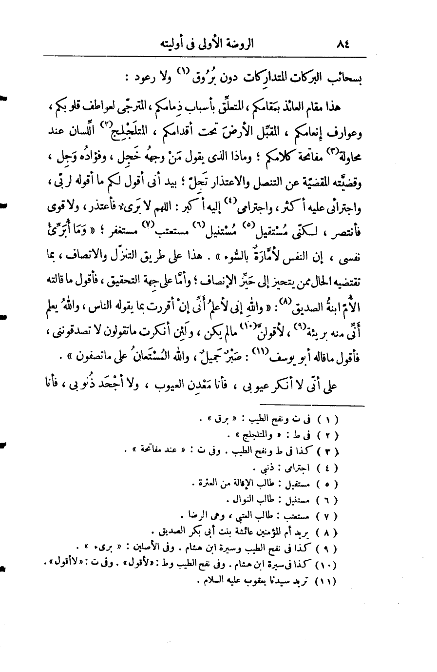 بسحاب البركات المتداركات دون بروق ولا رعود: هذا مقام العائذ بمقامكم، المتعلق بأسباب ذمامكم لعواطف قلوبكم، وعوارق إنعامكم، المقبل الأرض تحت أقدامكم، المتلجلج اللسان عند محاولة مفاتحة كلامكم؛ وماذا الذي يقول من وجهة خجل، وفؤاده وجل، وقضيته المقضية عن التنصل والاعتذار تجل، بيد أني أقول لكم لربى، واجترائي عليه أكثر وإجرامي إليه أكبر: اللهم لا برئ فأعتذر، ولا قوي فأنتصر، لكني مستقيل مستنيل مستعتب مستغفر؛ " وما أبرئ نفسي، إنَّ النفس أمارة بالسوء ". هذا على طريق التنزل والاتصاف، بما تقتضيه الحال ممن يتحيز إلى الإنصاف؛ وأما على وجهة التحقيق، فأقول ما قالته الأم ابنة الصديق: " والله إني لأعلم أني بما يقوله الناس، والله يعلم إني منه بريئة، ولأقولن ما لم يكن، ولئن أنكرت ما تقولون لا تصدقونني، فأقول ما قاله أبو يوسف: صبر جميل، والله المستعان على ما تصفون ".