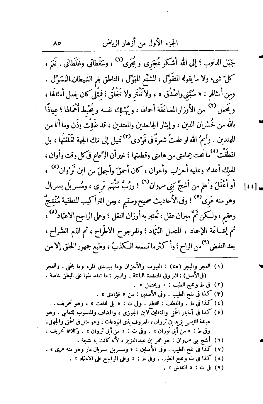 جبل الذنوب، إلى الله أشكو عجري وبجري، وسقطاتي وغلطاتي. نعم، كل شيء ولا ما يقوله المتقول، المشنع المهول، الناطق بفم الشيطان المسول. ومن أمثالهم: " سبني واصدق ". ولا تفتر ولا تخلق؛ فمثلى كان يفعل أمثالها، ويحمل من الأوزار المضاعفة أحمالها، ويهلك نفسه ويحبط أعمالها؛ عياذاً بالله من خسران الدين، وإيثار الجاحدين والمعتدين، قد ضللت إذن وما أنا من المهتدين. وأيم الله لو علمت شعرة في فودي تميل تميل إلى تلك الجهة لقلعتها، بل لقطفت ما تحت عمامتي من هامتي وقطعتها؛ غير أنَّ الرعاء في كل وقت وأوان، للملك أعدائه وعليه أحزاب وأعوان، كان أحمق وأجهل من أبن ثروان، أو أعقل من أشج بني مروان؛ ورب متهم برئ، ومسربل بسربال وهو منه عري؛ وفي الأحاديث صحيح وسقم، ومن التراكيب المنطقية منتج وعقيم، ولكن ثم ميزان عقل، تعتبر به أوزان النقل؛ وعلى الراجح الاعتماد، ثم إشاعة الإحماد، المتصل المتماد؛ وللمرجوع الأطراح، ثم الذم الصراح، بعد النفض من الراح؛ وأكثر ما تسمعه الكذب، وطبع جمهور الخلق إلا من