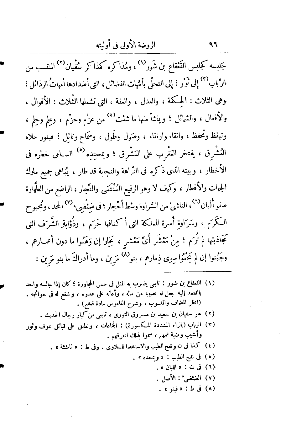 جليسه كجليس القعقاع بن شور، ومذكراه كمذكر سفيان المنتسب من الرباب إلى ثور، إلى التحلى بأمهات الفضائل، التي أضدادها أمهات الرذائل؛ وهي الثلاث: الحكمة والعدل والعفة، التي تشملها الثلاث: الأقوال، والأفعال، والشمائل؛ وينشأ منها ما شئت من عزم وحزم، وعلم وحلم، وتيقظ وتحفظ، واتقاء وارتقاء، وصول وطول، وسماح ونائل؛ فبور حلاه المشرق، يفتخر المغرب على المشرق؛ وبمحتده السامي خطره في الأخطار، وبيته الذي ذكره في النباهة والنجابة قد طار، يباهي جميع ملوك الجهات والأقطار، وكيف لا وهو الرفيع المنتهى والنجار، الراضع من الطهارة صفو ألبان، الناشئ من السراوة وسط أحجار، في ضثضئ المجد، وبحبوح الكرم، وسراوة أسرة المملكة التي أكنافها حرم، وذؤابة الشرف التي مجاذبها لم ترم؛ من معشر أي معشر، بخلو إن وهبوا ما دون أعمارهم، وجنوا إن لم يحملوا سوى ذمارهم، وبنو مرين، وما أدراك ما بنو مرين: