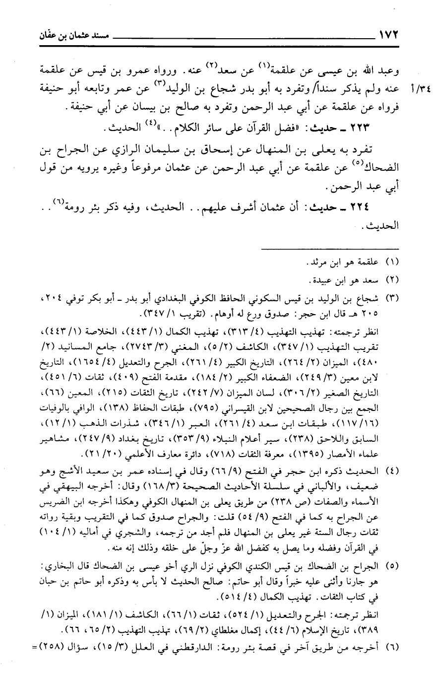 تفرد بِهِ يعلى بن الْمنْهَال عَن إِسْحَاق بن سُلَيْمَان الرَّازِيّ عَن الْجراح بن الضَّحَّاك عَن عَلْقَمَة عَن أبي عبد الرَّحْمَن عَن عُثْمَان مَرْفُوعا وَغَيره يرويهِ من قَول أبي عبد الرَّحْمَن.