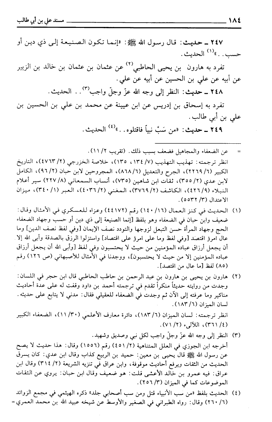 تفرد بِهِ هَارُون بن يحيى الْحَاطِبِيُّ عَن عُثْمَان بن عُثْمَان بن خَالِد بن الزبير عَن أَبِيه عَن عَليّ بن الْحُسَيْن عَن أَبِيه عَن عَليّ.