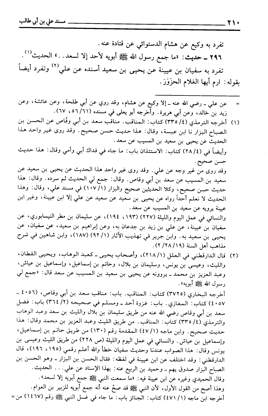 تفرد بِهِ سُفْيَان بن عُيَيْنَة عَن يحيى بن سعيد أسْندهُ عَن عَليّ وَتفرد أَيْضا بقوله: ارْمِ أَيهَا الْغُلَام الحزَور.